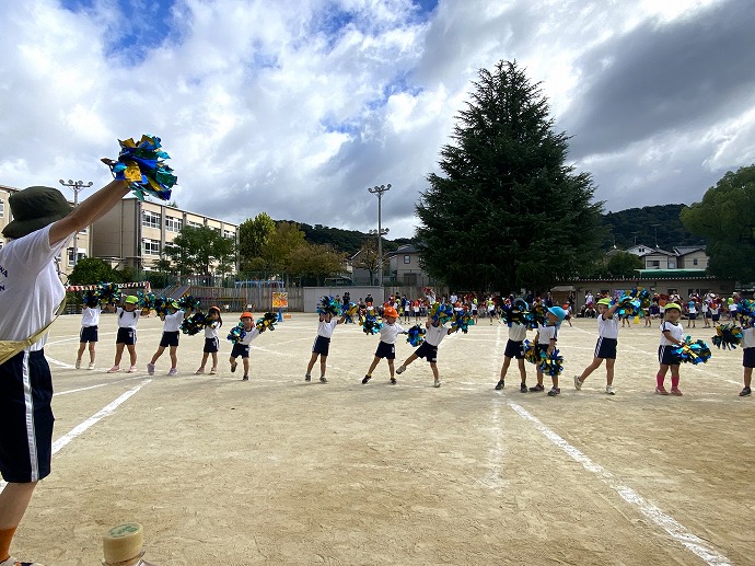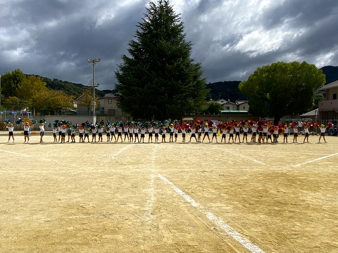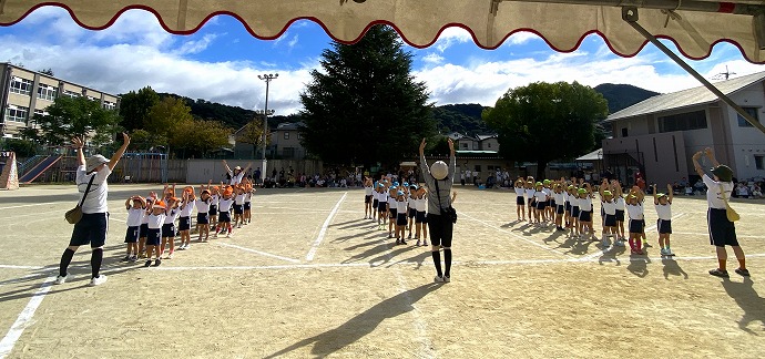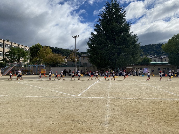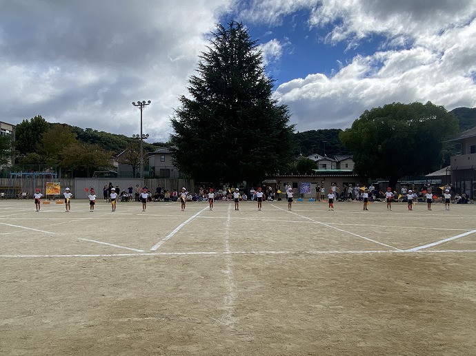 青空が広がり、風が通る爽やかな秋の日を迎えられたことは本当に有難いことでした。空を仰ぐ年長クラス🚩。旗体操の曲はスーザー作曲の「美中の美」。曲名のように、子ども達自身で等間隔を保ちながらの美しい行進遊戯でした。