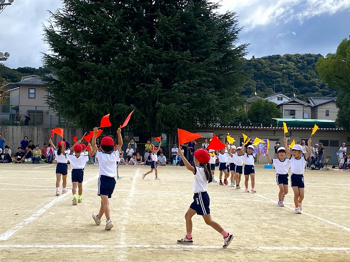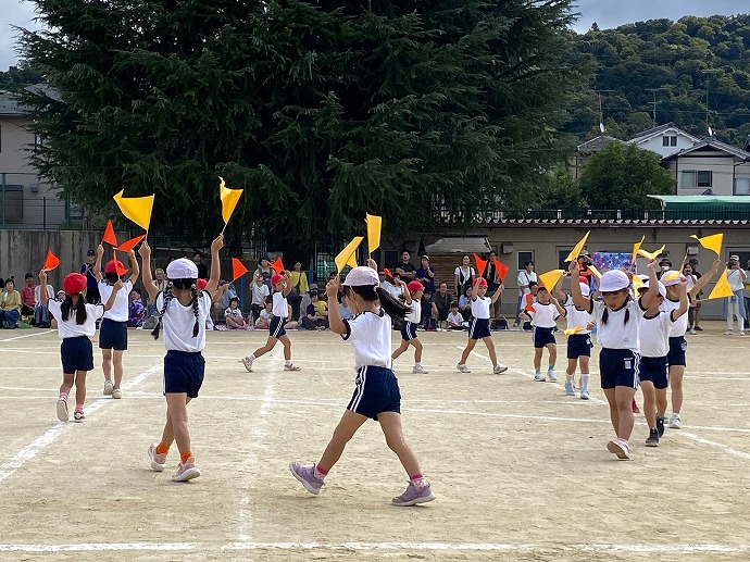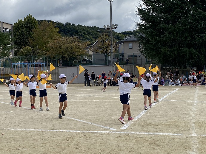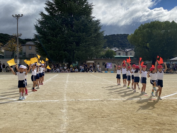 最後はもとの一列になり旗を掲げて~🚩🚩 青空のもと旗の音が響く美しい行進遊戯でした♪