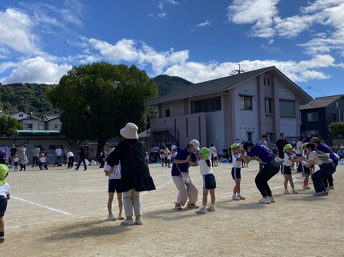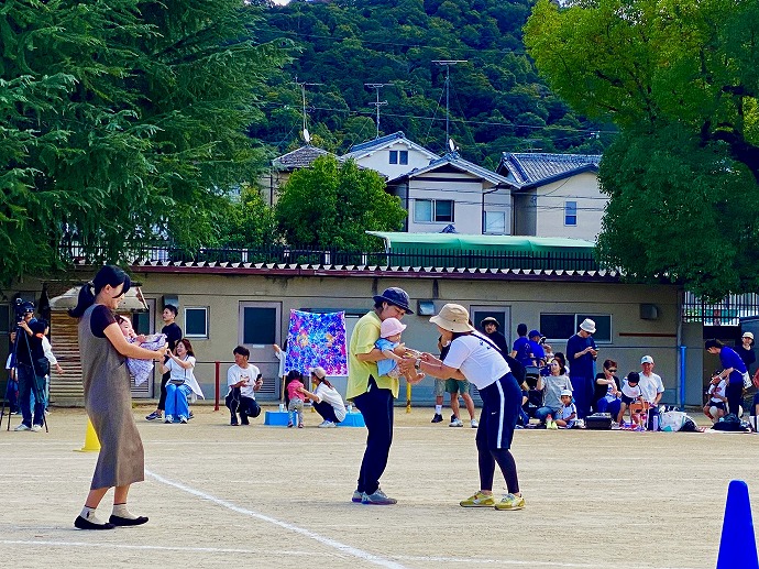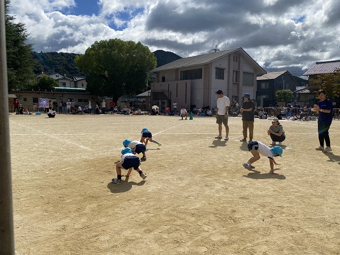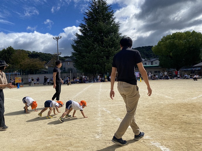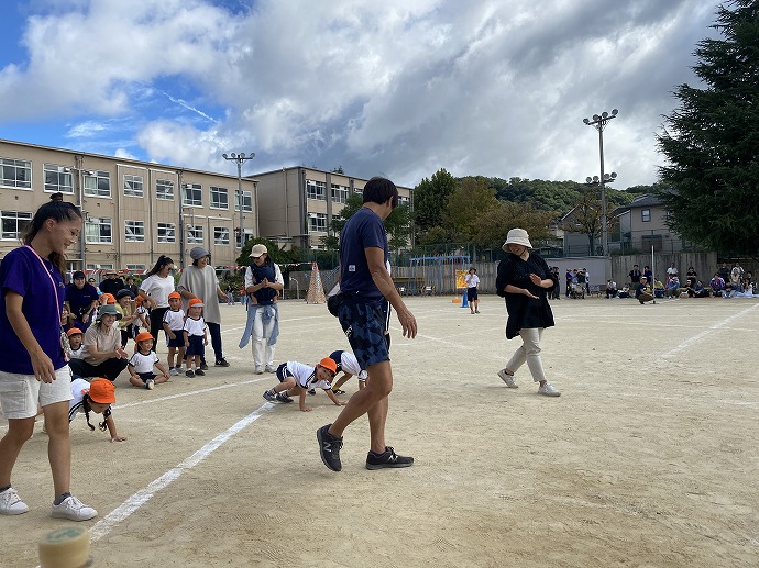 続く年長クラスの親子競技はワンランクアップで後ろ向きくまさんから始まりましたが、ついつい見惚れてしまい撮影できずでした💦