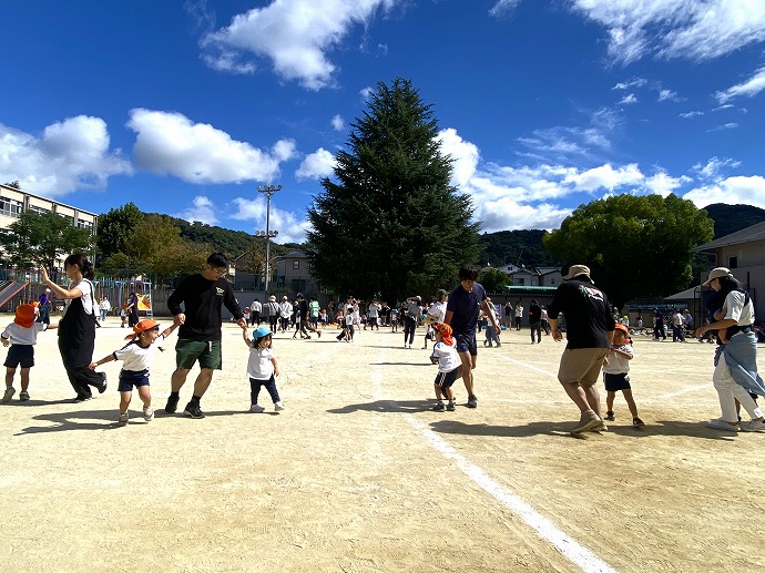 大きな二重の和になって行った親子のフォークダンス。すでに広がった青空のもとで。