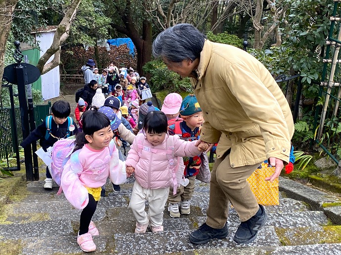 満3歳児Sちゃんは本日が初登園。年中Nちゃんに手をつないでもらって元気に到着しました。