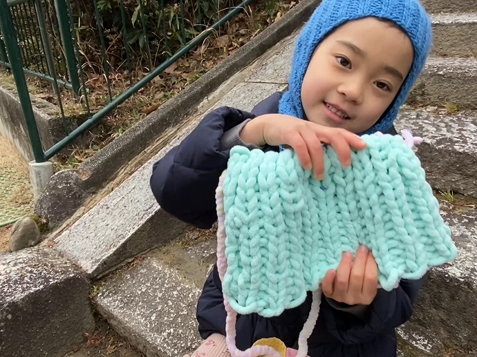 「こんなバッグをつくったの~!」 冬休みに指編みでつくった手づくりバッグのようです✨👜。まあ✨ 手編みのメリヤス編み♡♡♡