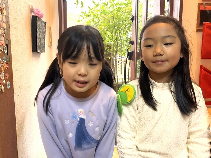各クラスで朝のお仕度のあと、年長クラスのお当番さん二人MちゃんSちゃんが来てくれました。二人とも大張り切りで元気100%✨そして定番のお当番さんのご挨拶は丁寧に「つきAぐみです。おねがいします!」