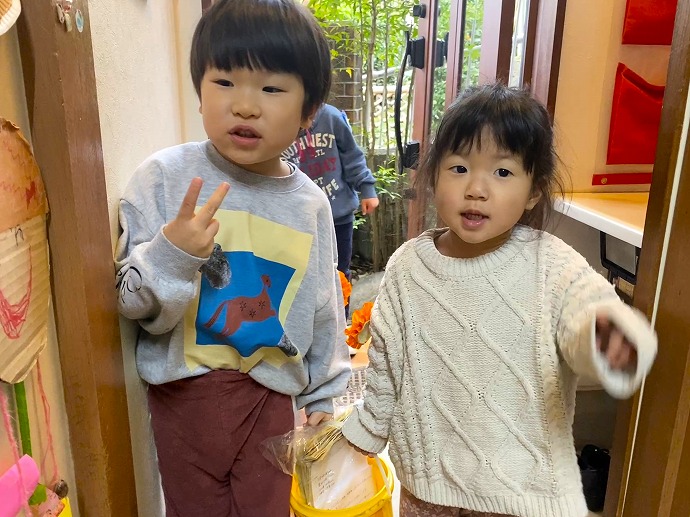 そして年少クラスからUちゃんHちゃん✌👦👧✌ (後ろで待っている年中のKくんはHちゃんのお兄さん。「Hのご挨拶の声が聞こえないよ?」とちょっぴり心配も。大丈夫!満3歳児のHちゃんは小さな声でもちゃんとご挨拶ができました)