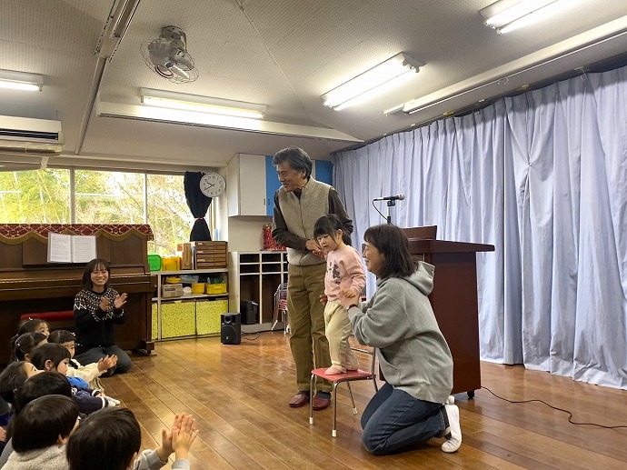 つづいて9時半からは始業式を行いました。みんなで園歌「おやまのようちえん」を斉唱し、園長先生からのお話のあと、今日から満3歳児入園のSちゃんがお仲間に入られたことをみんなで喜びました。ご紹介では「よろしくおねがいします」とSちゃんもみんなに伝えることができました😊💕