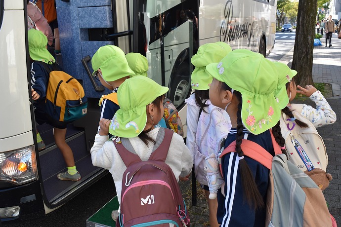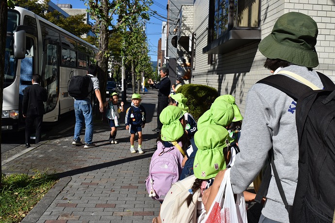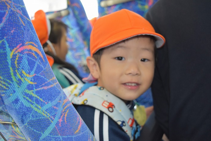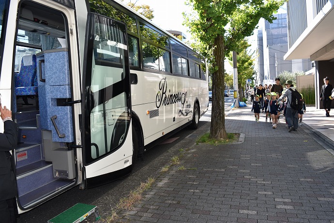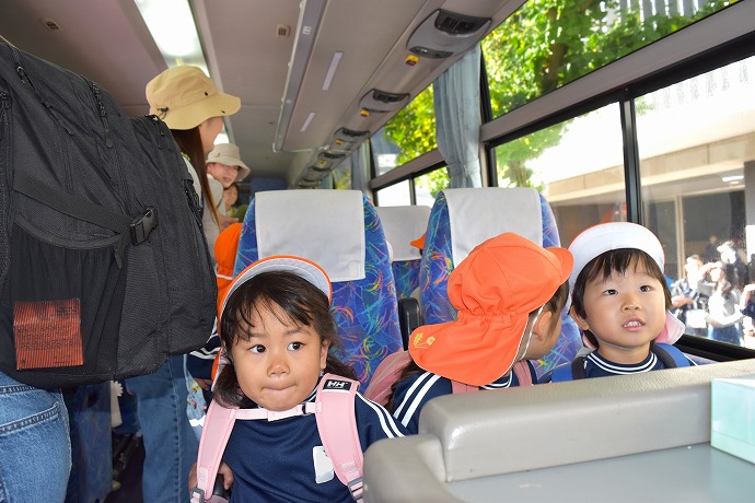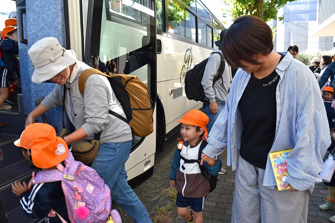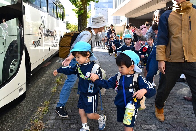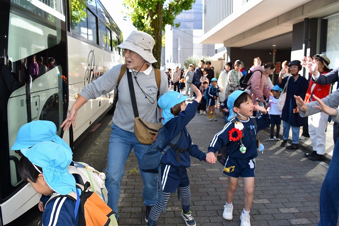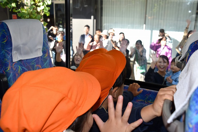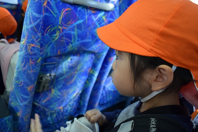いってらっしゃーい✨とママやパパの声が聞こえてきます。普段は歩いて登園しているのでバスに乗るのはワクワクします。
