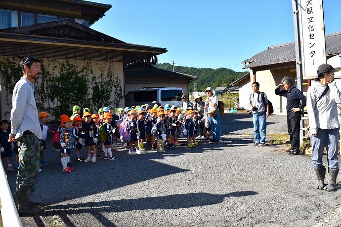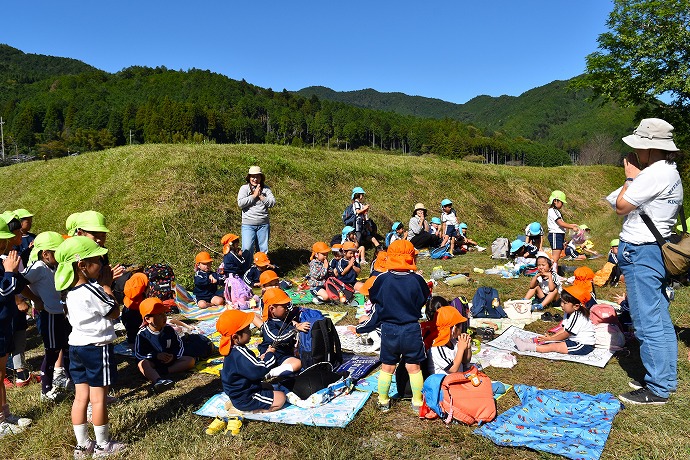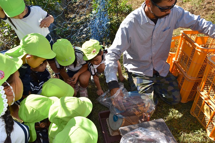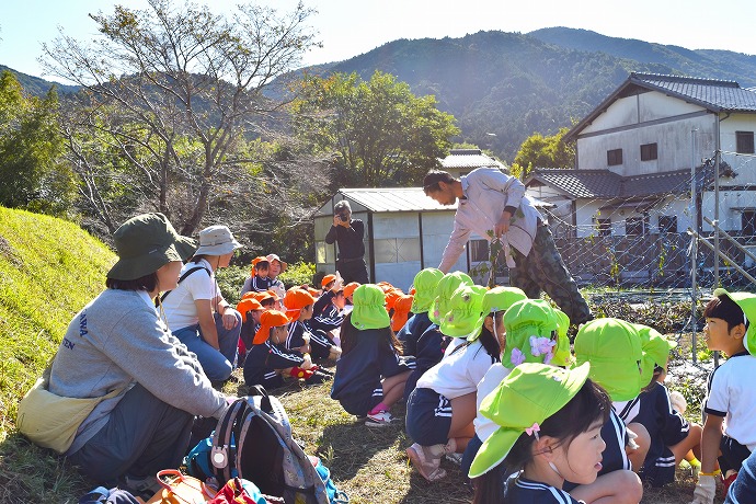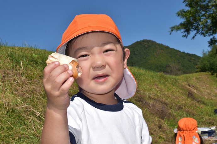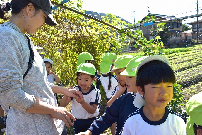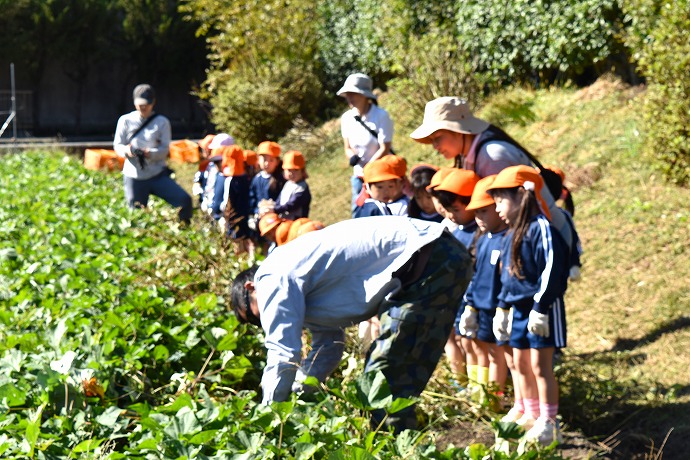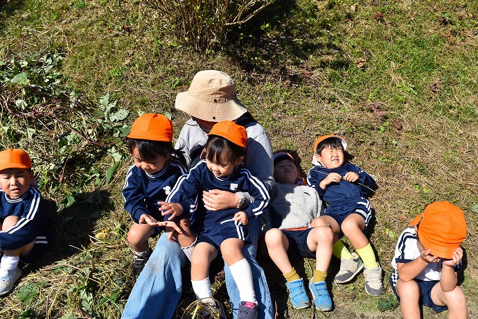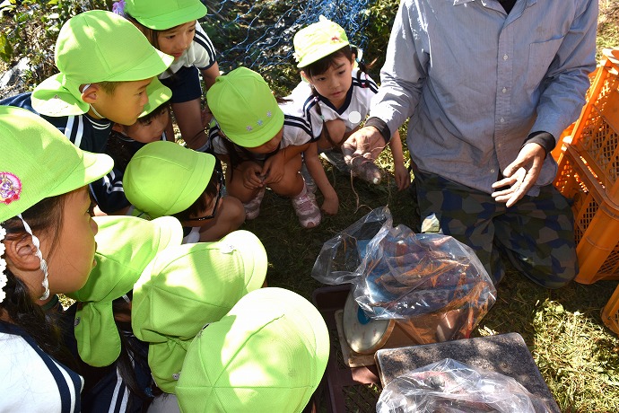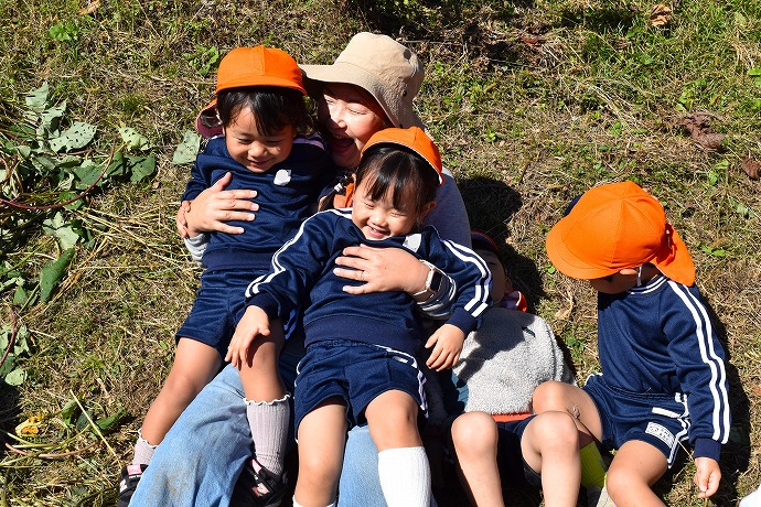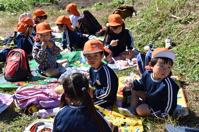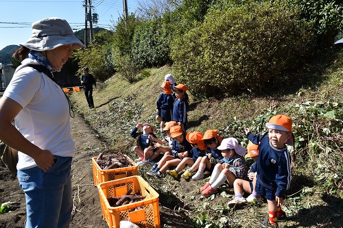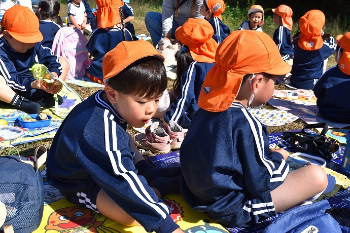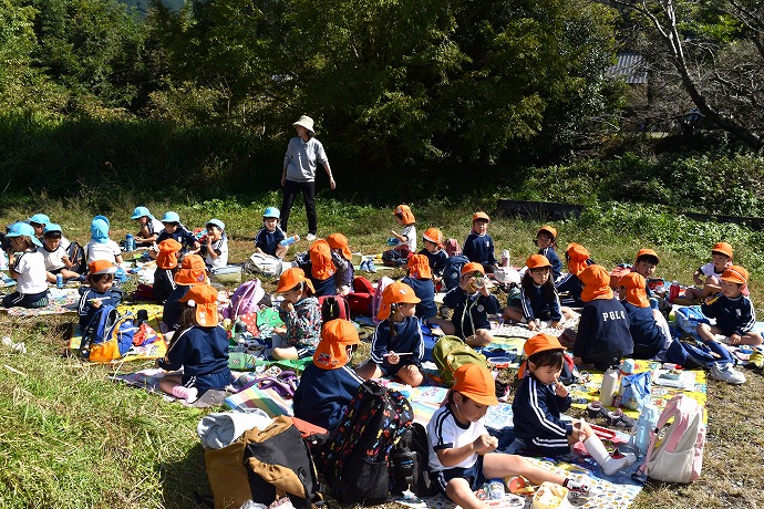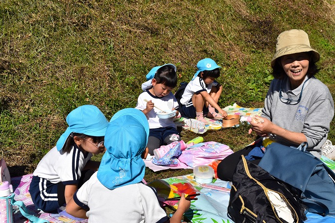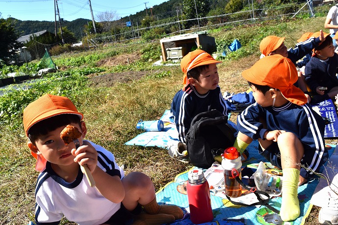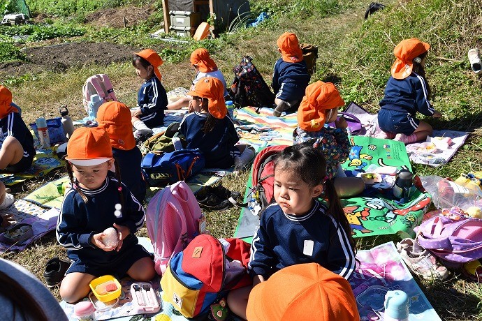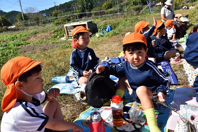 年長クラスも一緒にお弁当🍱を食べていた頃、つくだ農園さんご夫婦が来られみんなでご挨拶をしました。「ありがとうございました」。お陰様でまたとない貴重なお芋堀りの体験ができました。