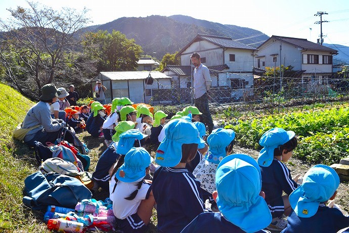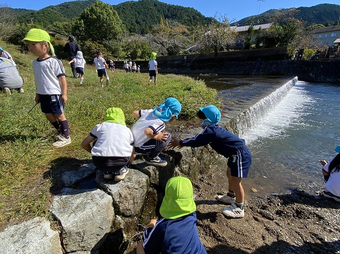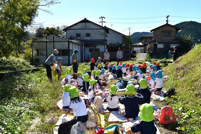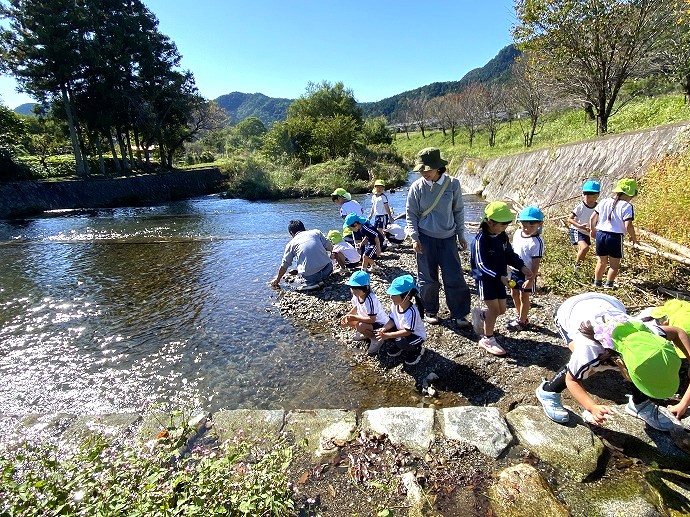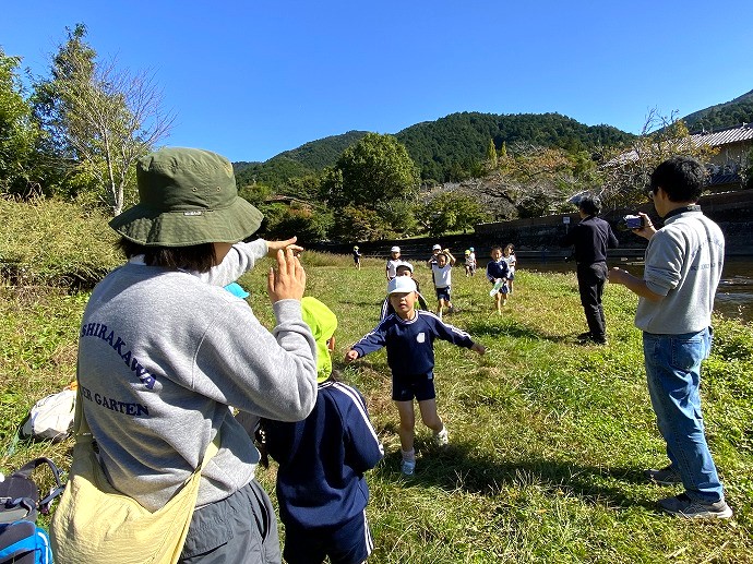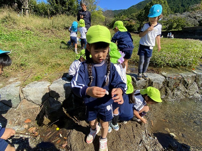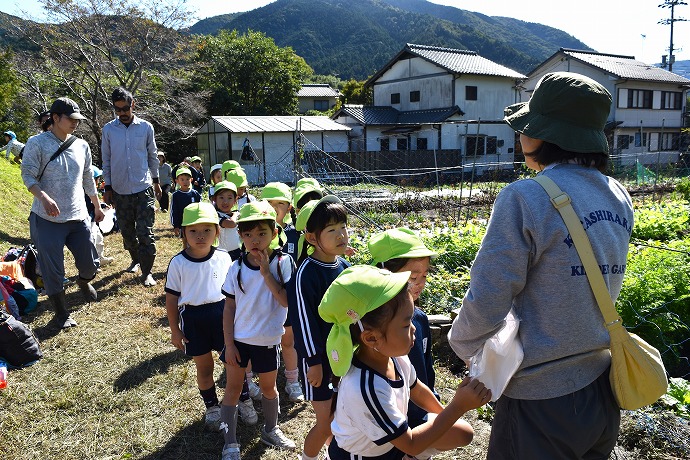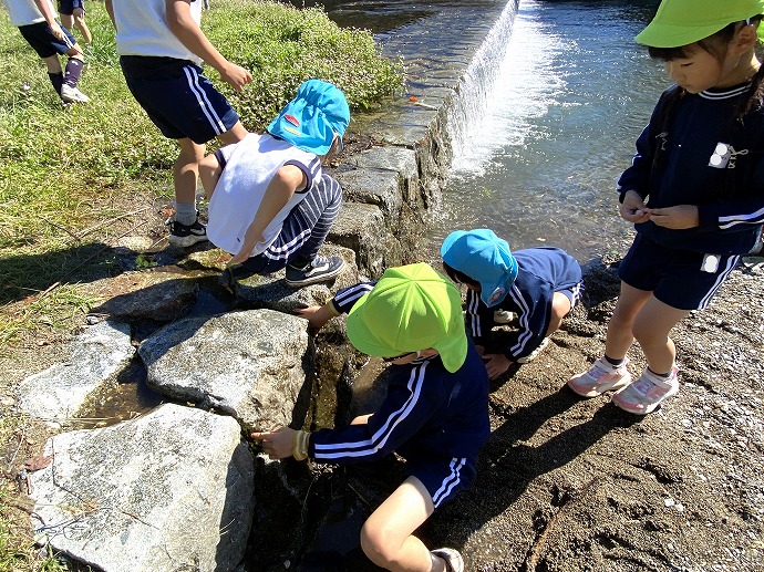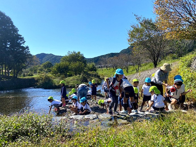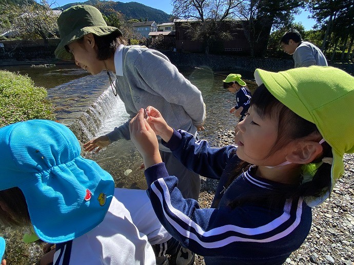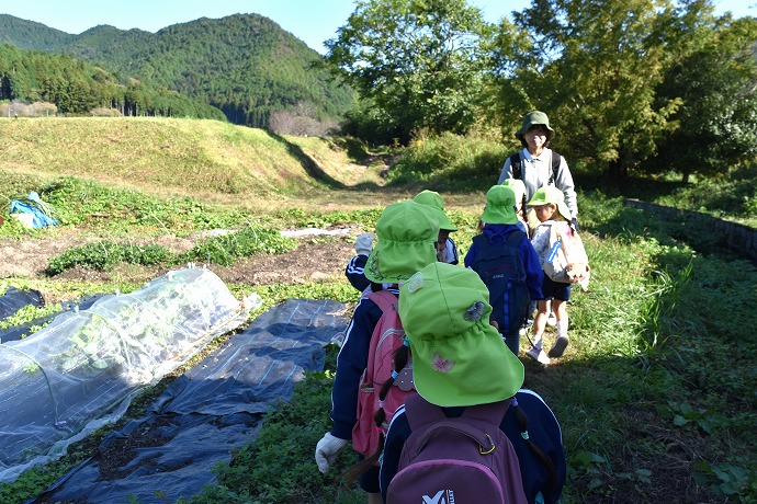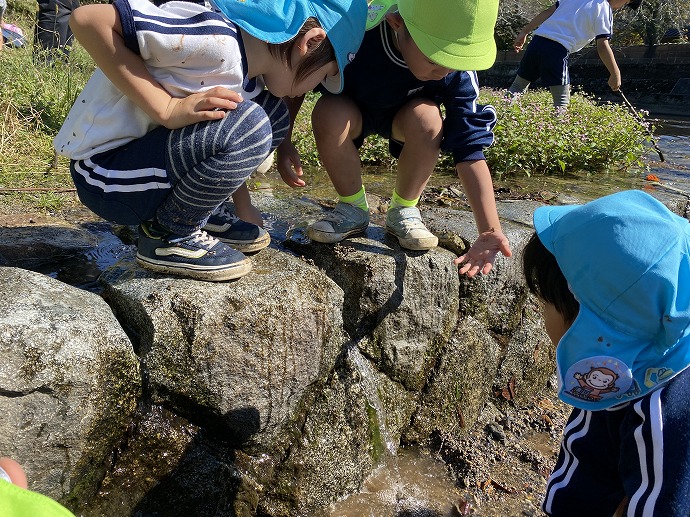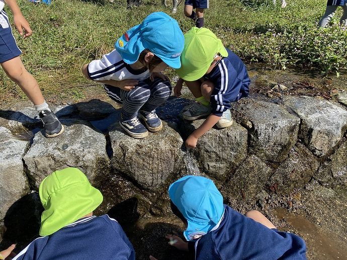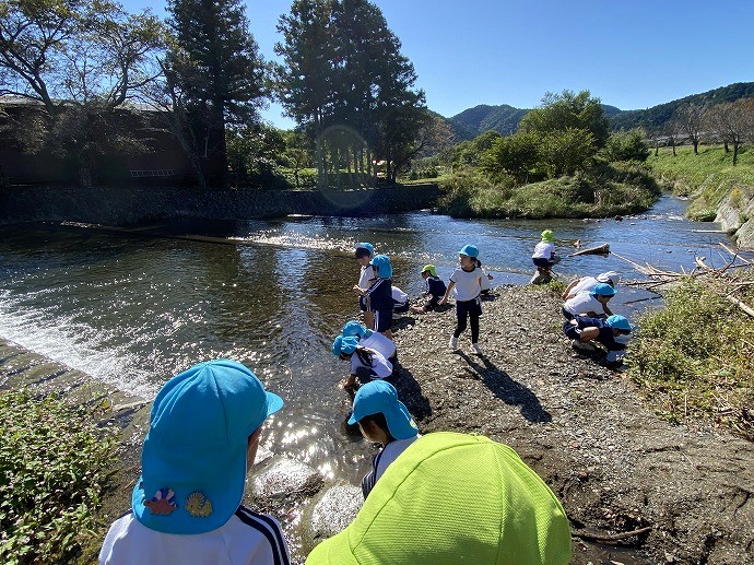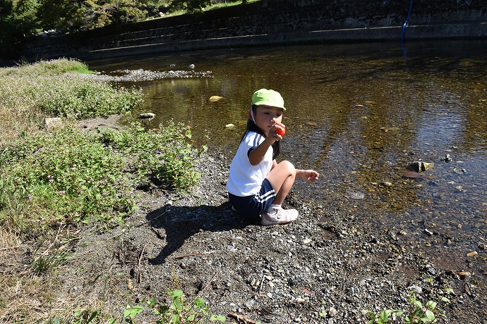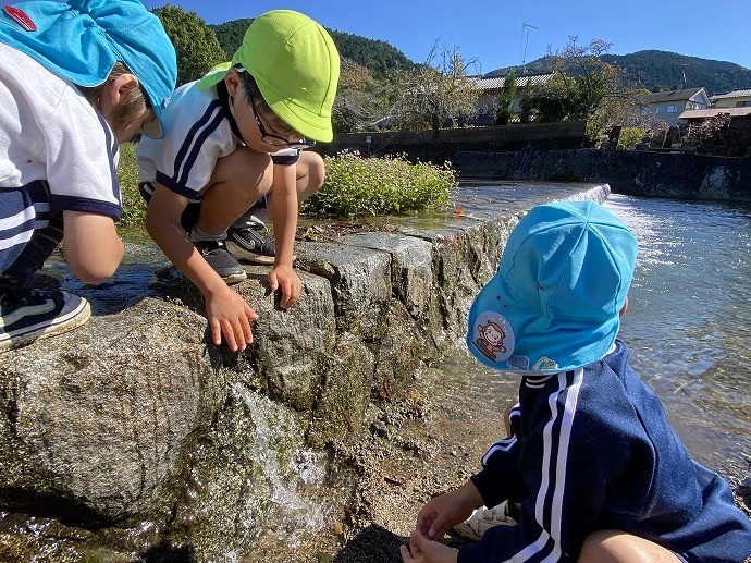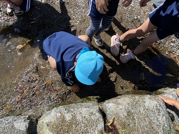 その後、年少クラスは紙芝居などを観ながら近くでゆっくりと過ごしました。年中長クラスは畑の横に流れている高野川上流の川まで散策にいくことにしました。