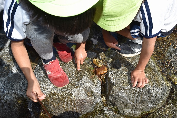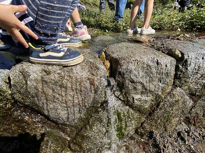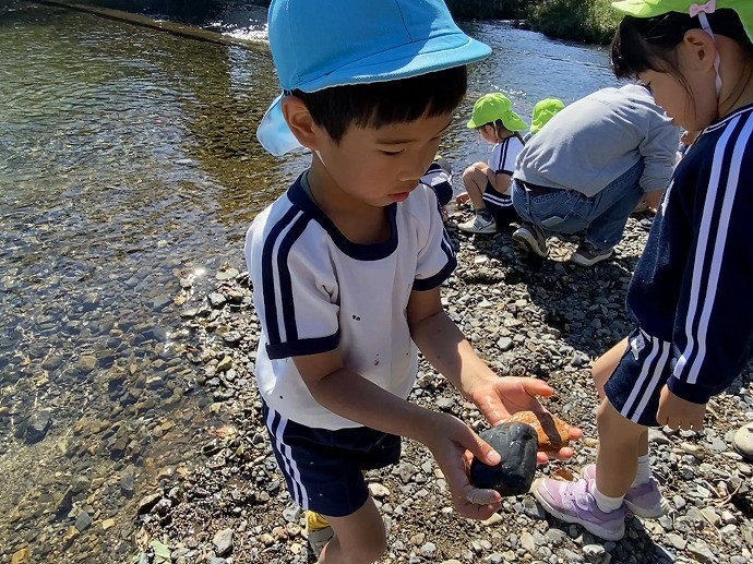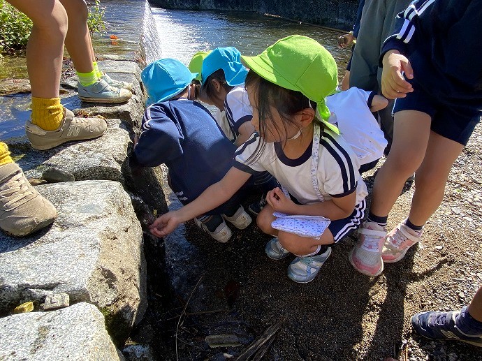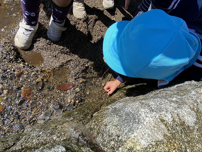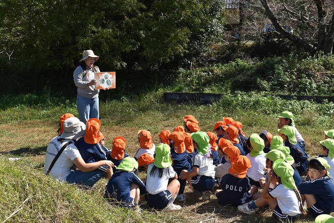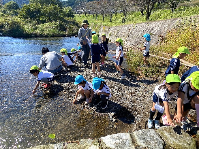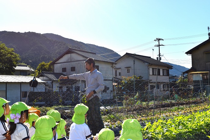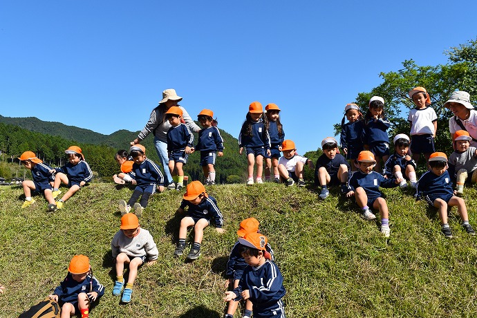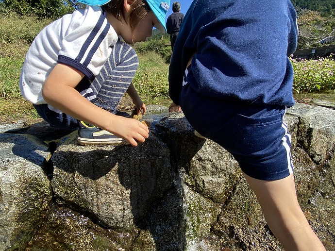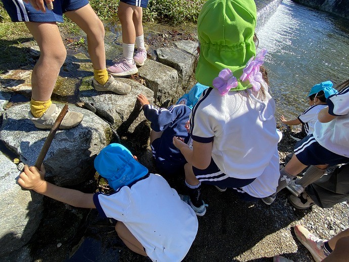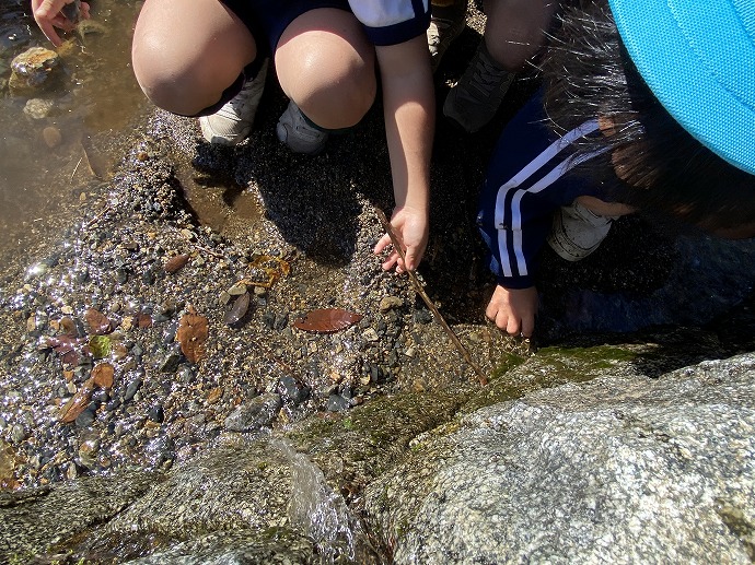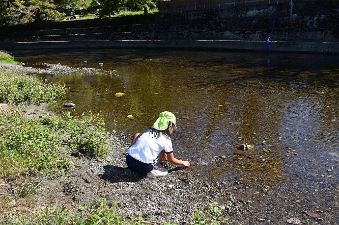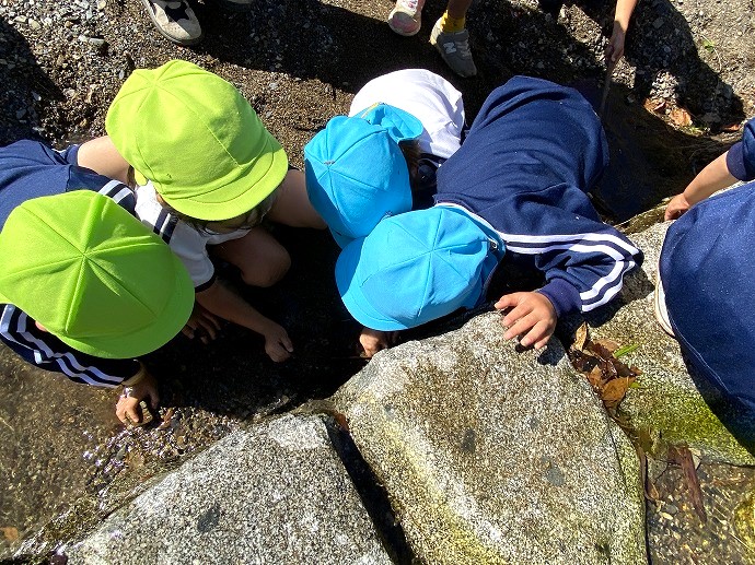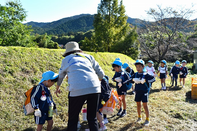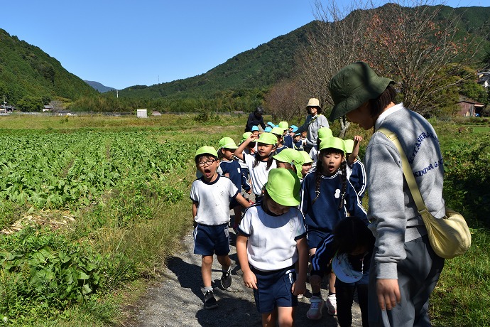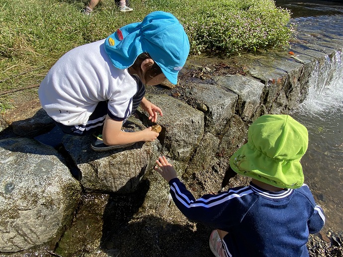 その後、年少クラスは紙芝居などを観ながら近くでゆっくりと過ごしました。年中長クラスは畑の横に流れている高野川上流の川まで散策にいくことにしました。