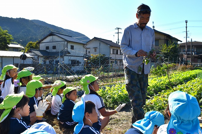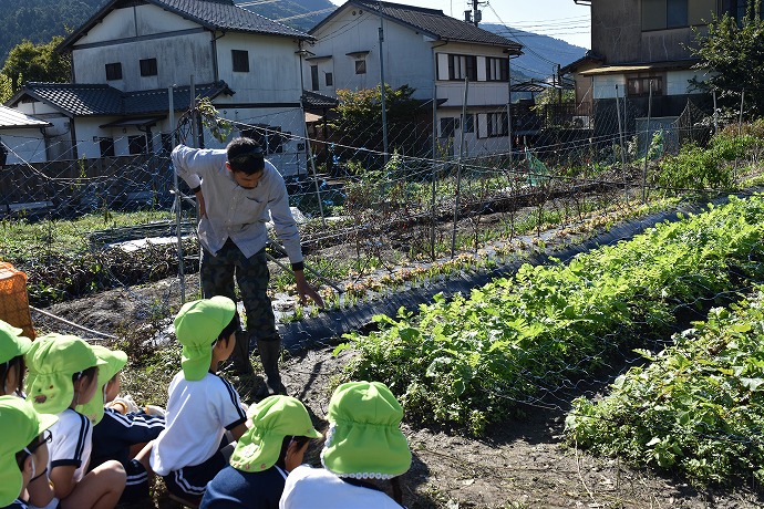農園主の渡辺さんよりご挨拶と畑についてのお話があり、子ども達に「なべちゃんと呼んで下さい」と優しく自己紹介して下さいました(通称なべちゃん👨)。