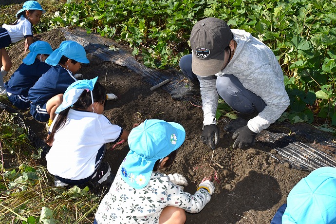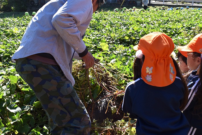 「サツマイモの葉っぱはこんな形で、このように長く蔓が伸びてその先にたくさんの葉っぱをつけて育ちます。そして蔓と葉の下の土の中にはサツマイモがたくさん育っています。それを今日は手でそっと掘りましょう。お芋の皮がめくれてしまうと傷んでしまいます。また無理に引っ張るとポキっと折れてしまうこともありますから、先に丁寧にまわりの土を除けながら皮がめくれないように気をつけて掘っていきましょう」
