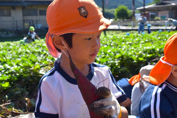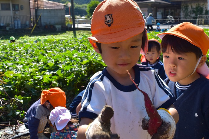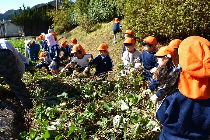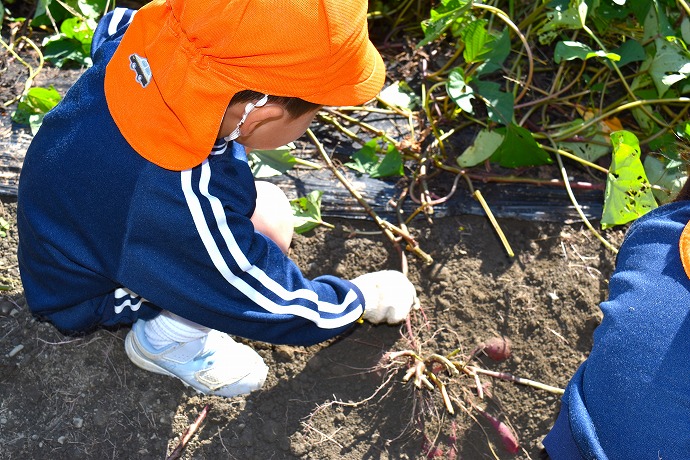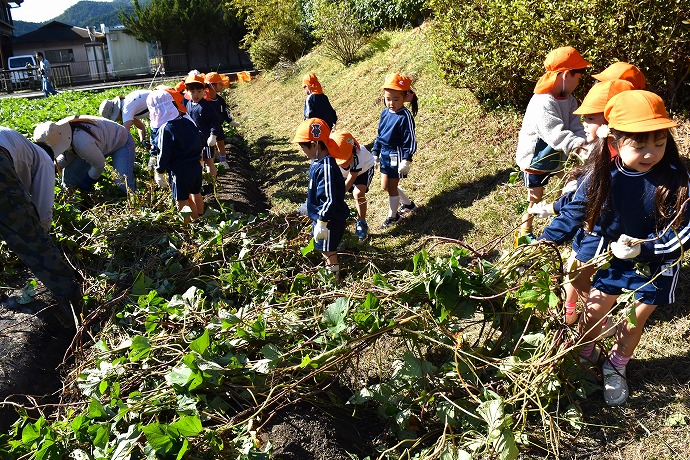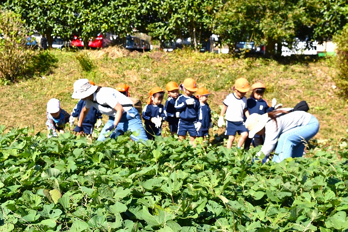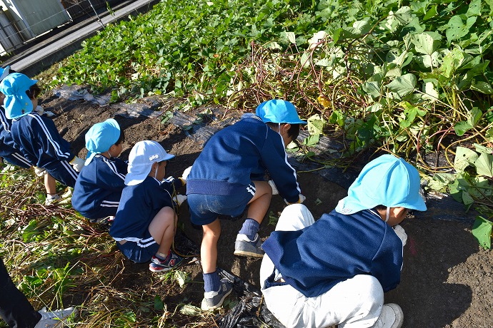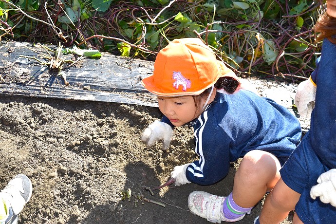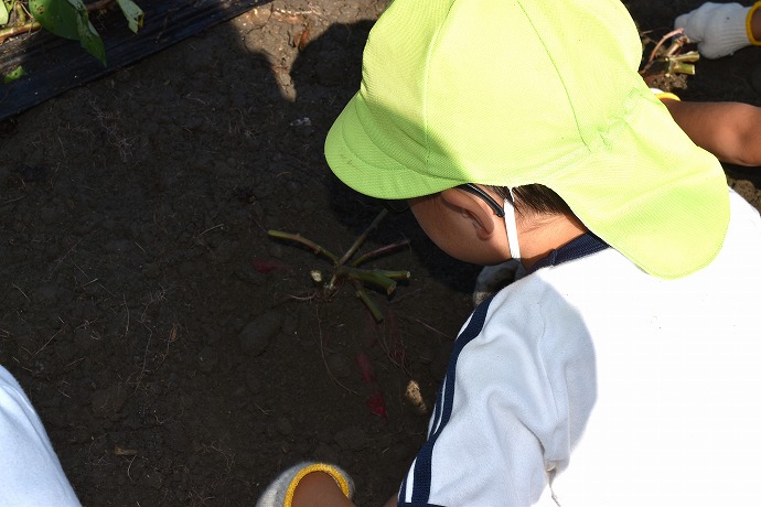 こちらは年中長のお芋です。大人がハサミを手に蔓の株元を見つけてカットしては蔓を子ども達が引っ張ります。