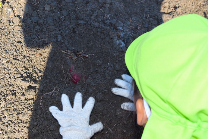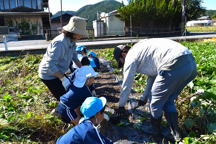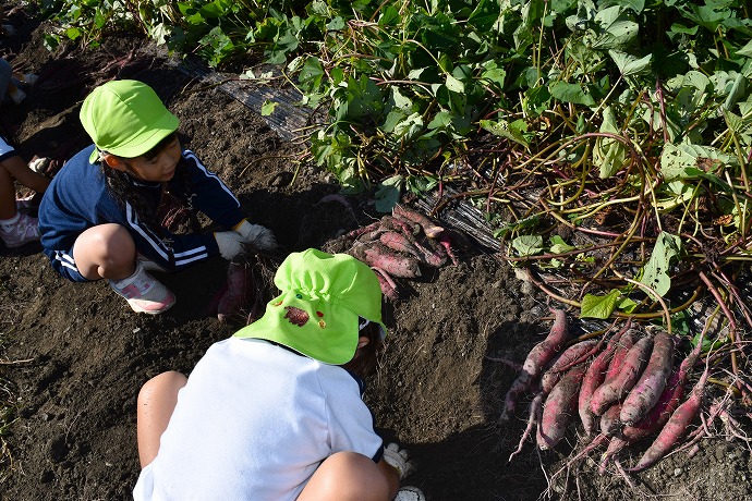 年中長クラスは畑の東側へ。向かい合いながらのお芋掘りです。