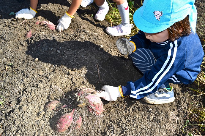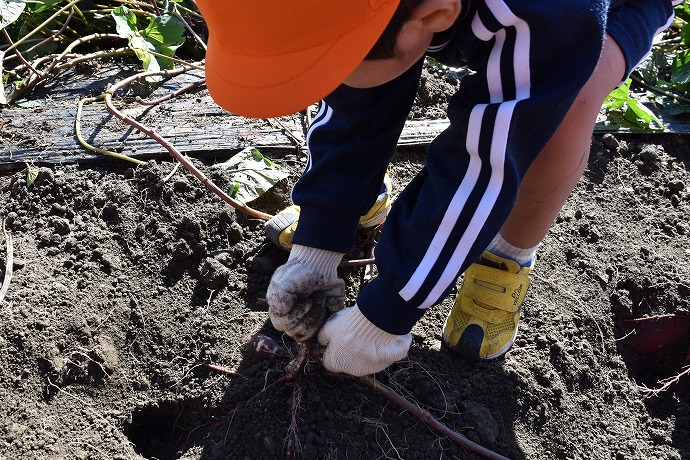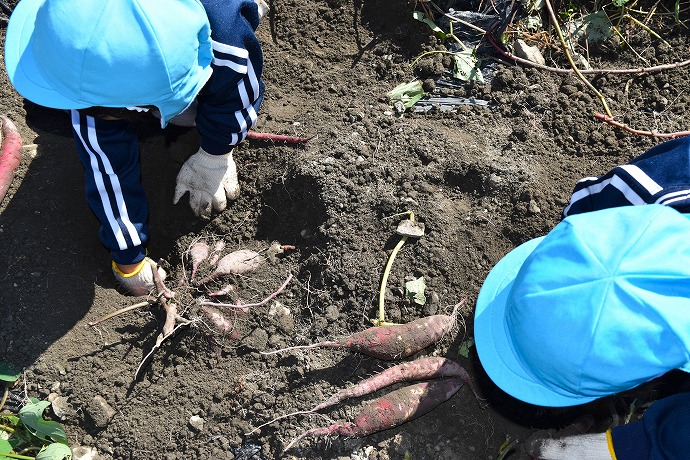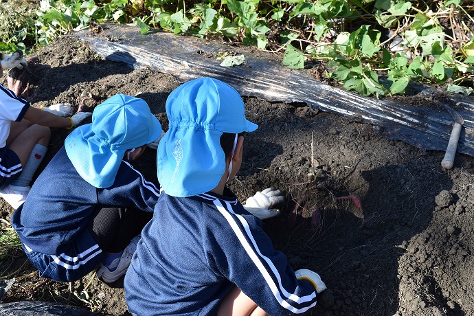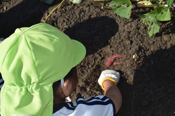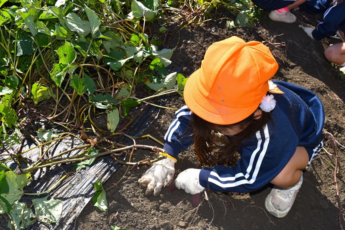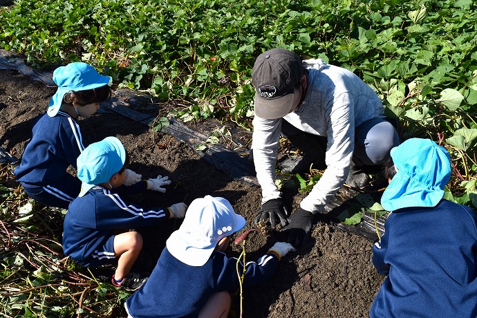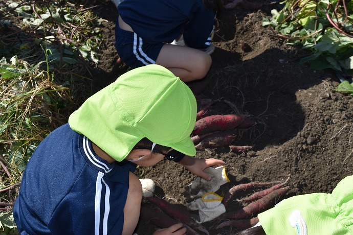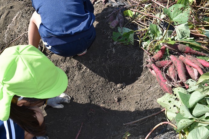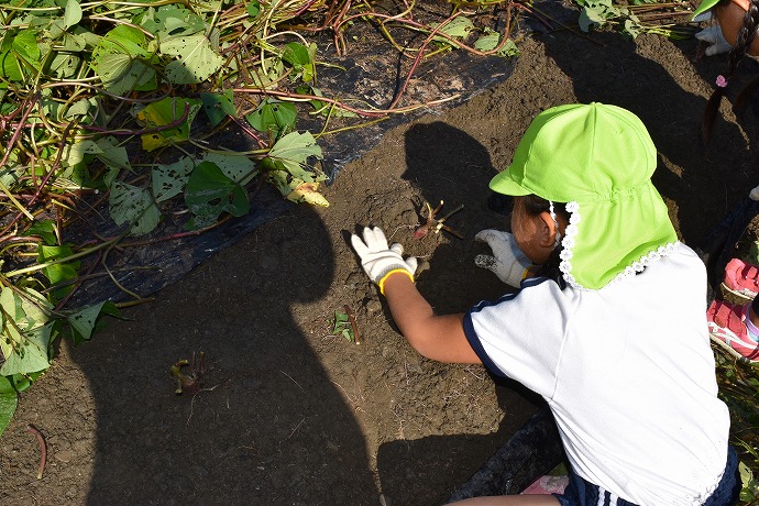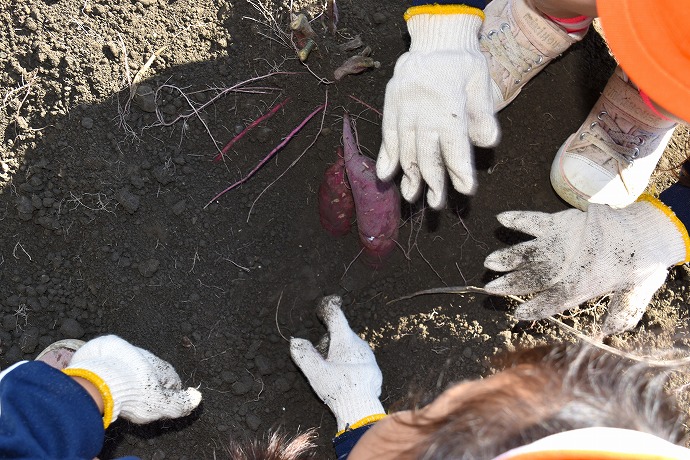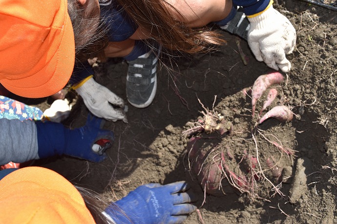 こうして、こうして。みんなお芋が傷つかないように大事に掘っています。