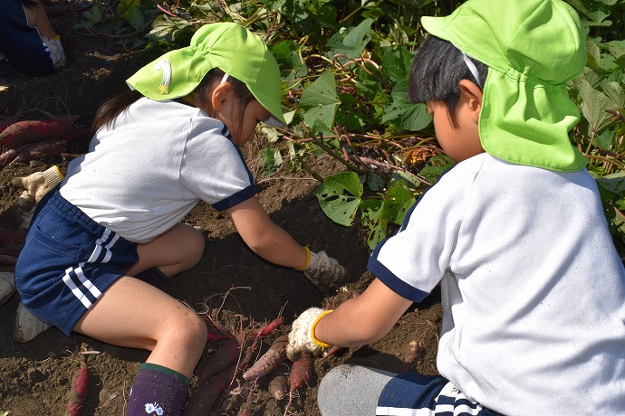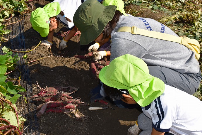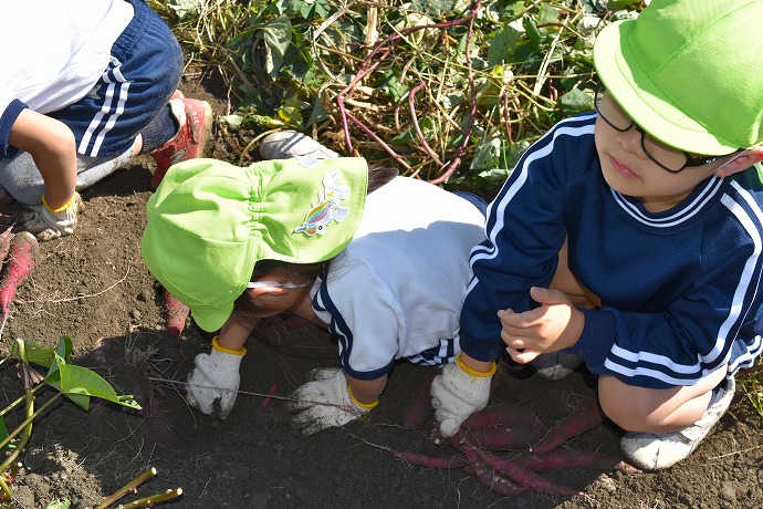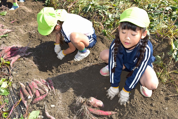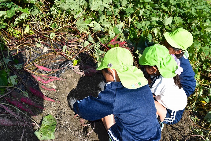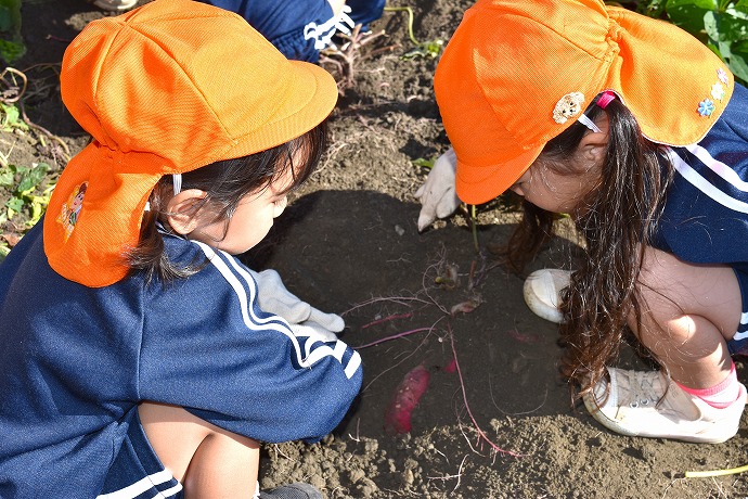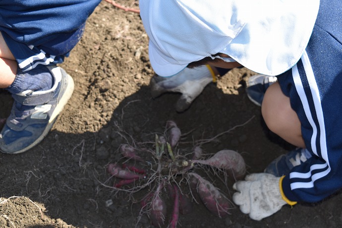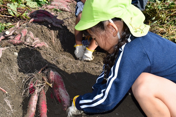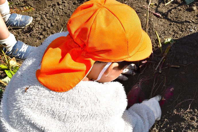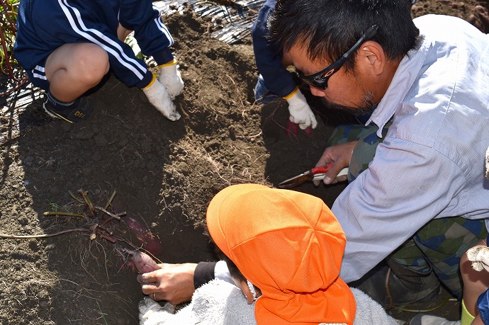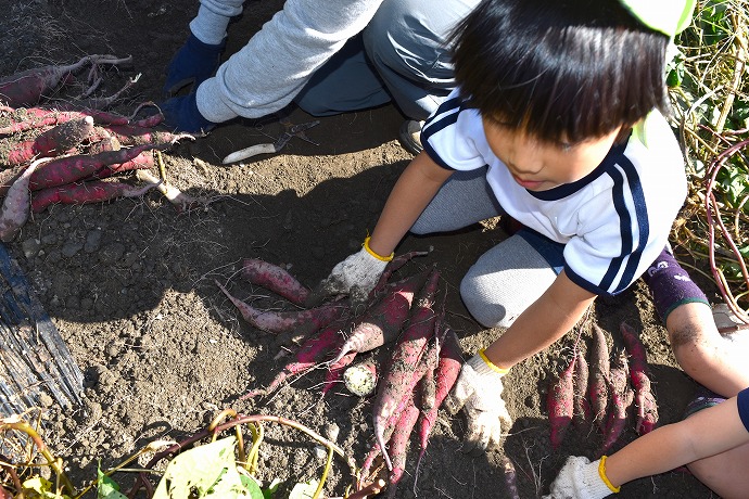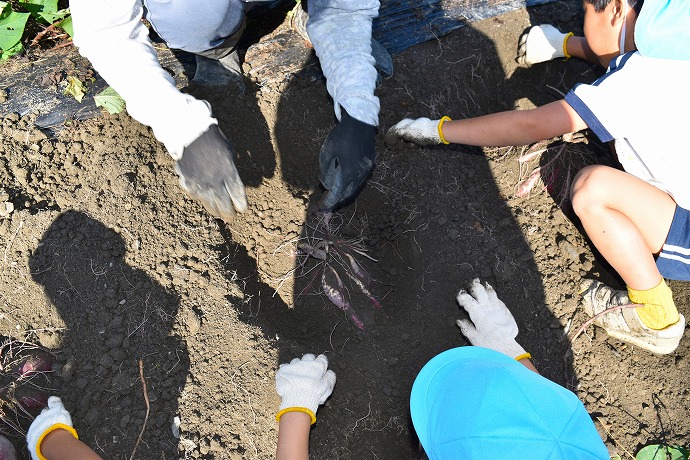 こうして、こうして。みんなお芋が傷つかないように大事に掘っています。