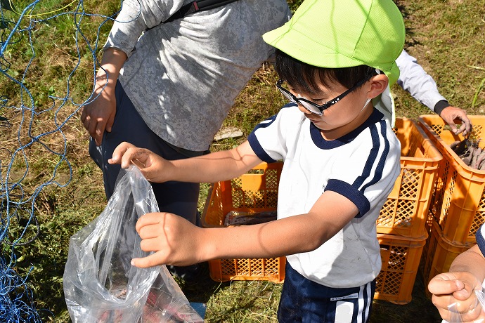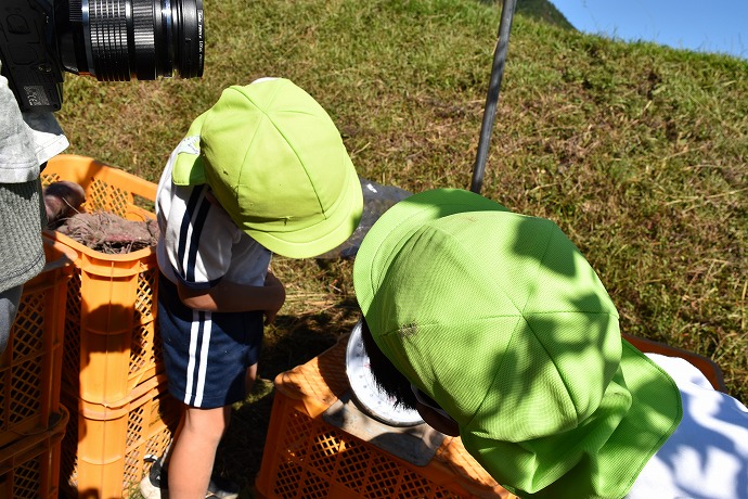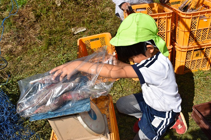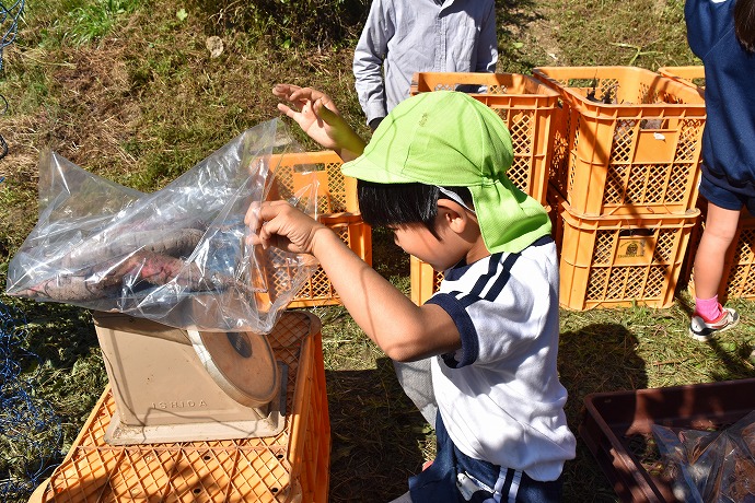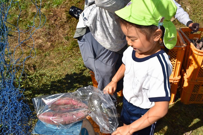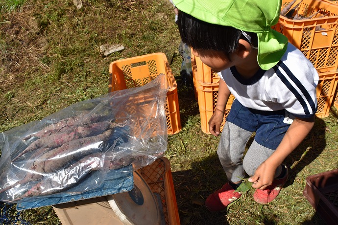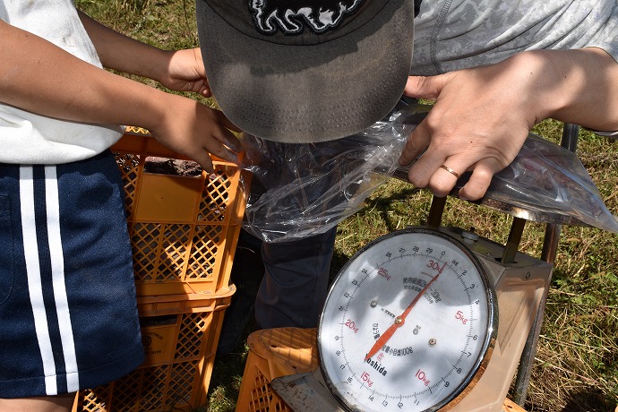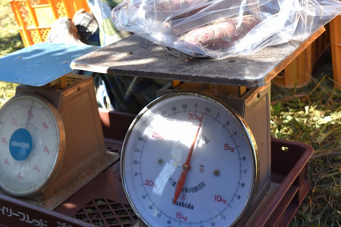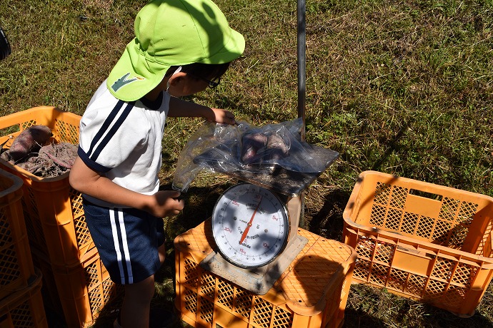 こうして全員が1kg分ずつを自分で量ってお芋を入れていきました。kgという重さの単位があること、量りでお芋の重さを量る体験ができた大変貴重なひと時となりました。