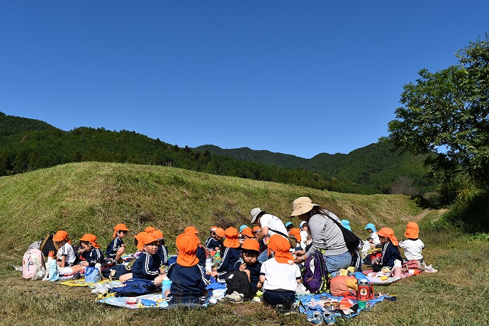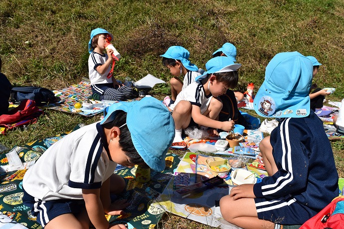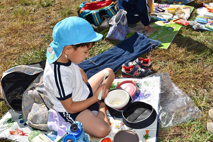 青空の下でのお弁当タイム。美味しいのひと言に尽きるようでみんなとても静かです😊