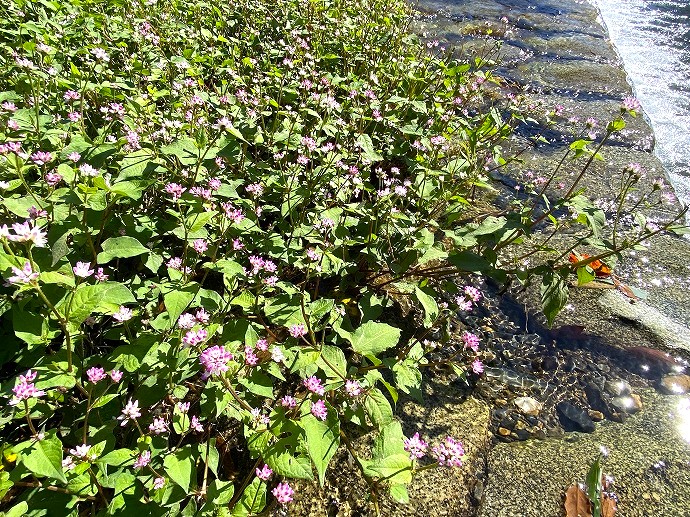 ミゾソバが一面に自生しピンク色の花を咲かせています。湿地を好む植物なので園のビオトープにもよいのかも👆 水面がキラキラ輝いています。