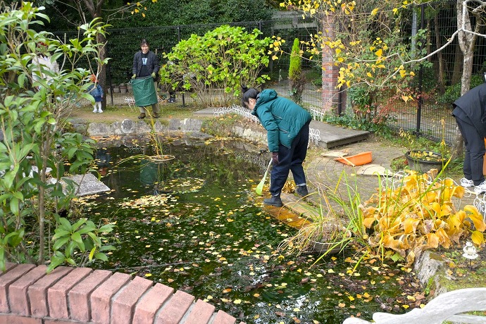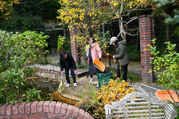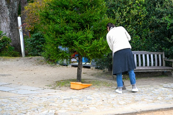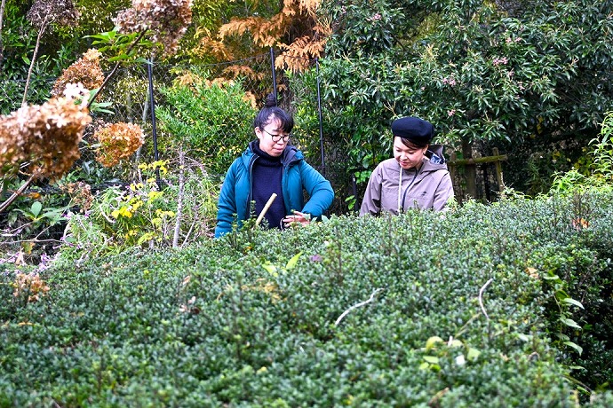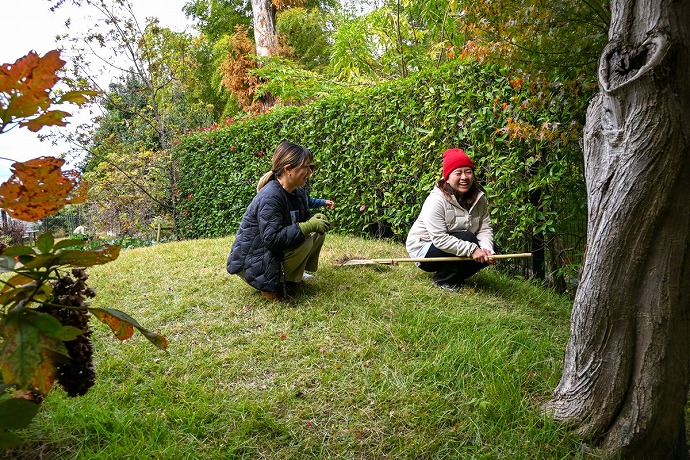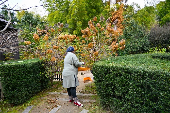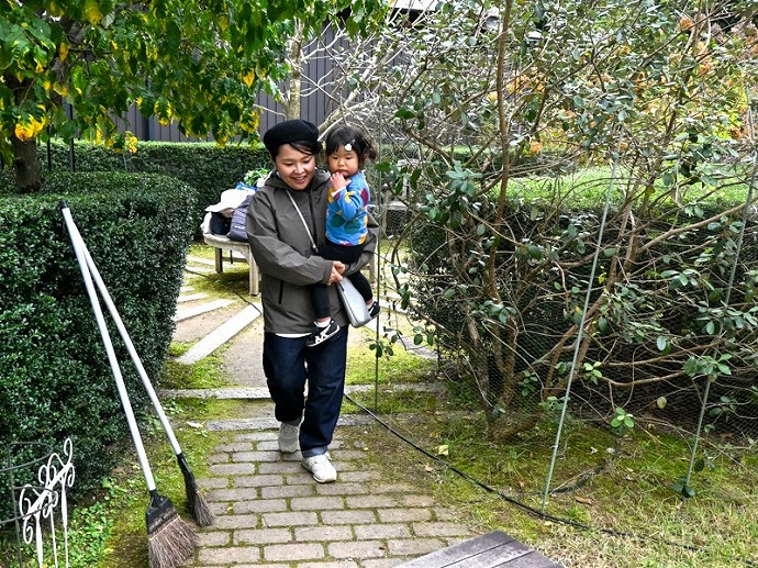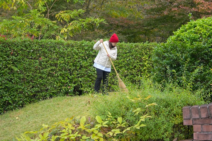 Uママが築山のお手入れ中。赤いキャップ帽が映え素敵💕