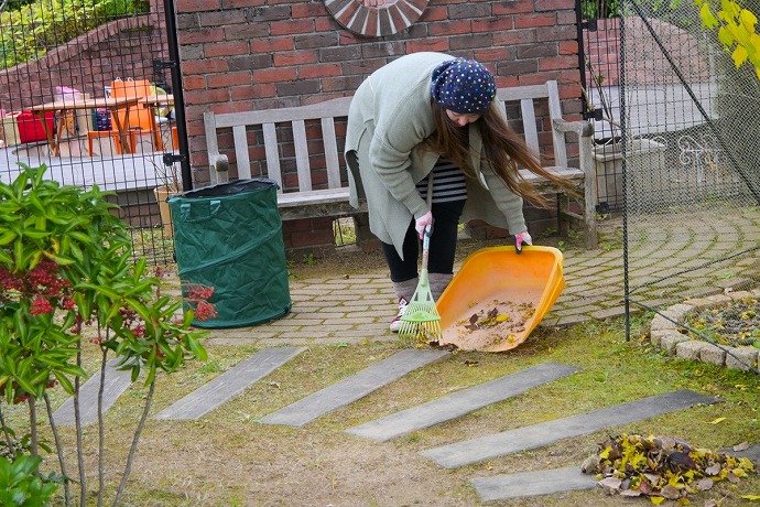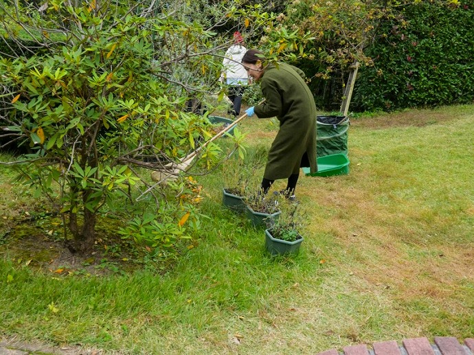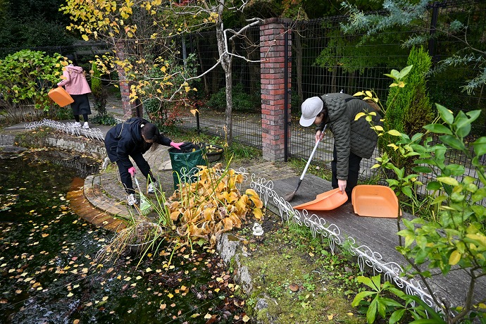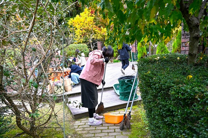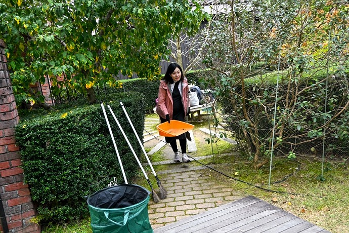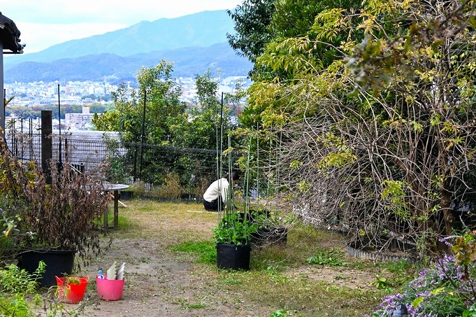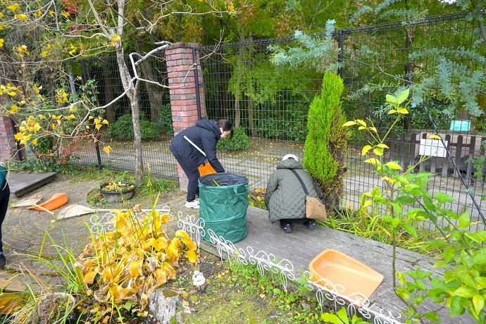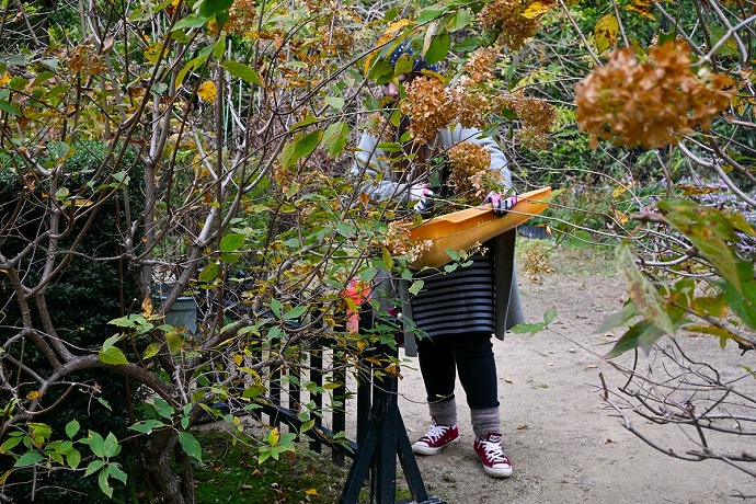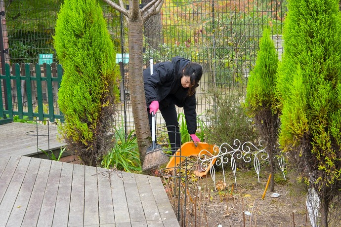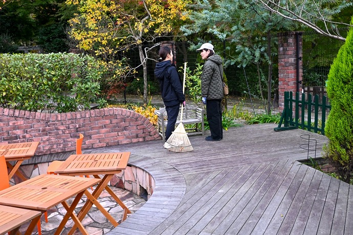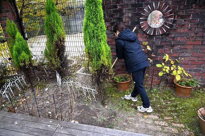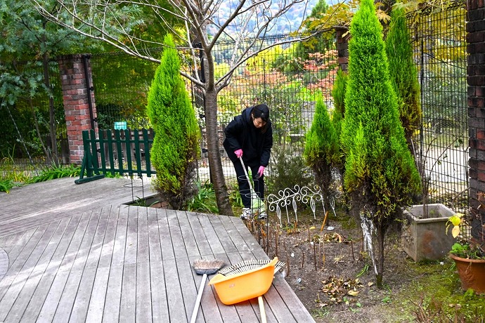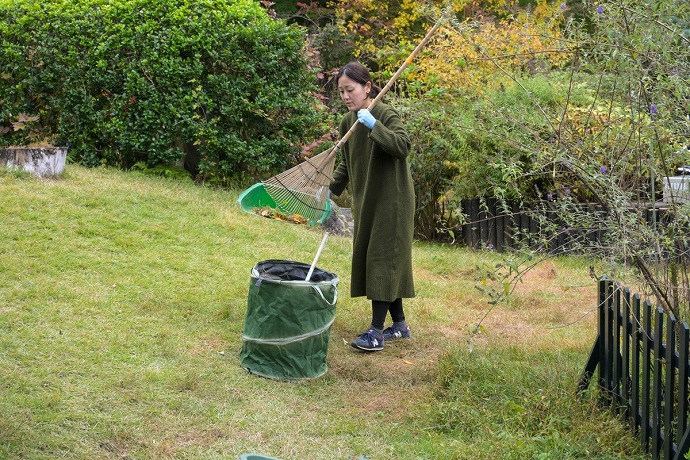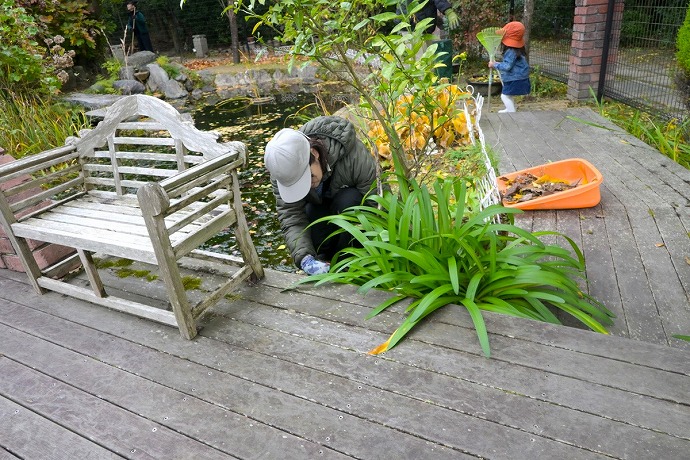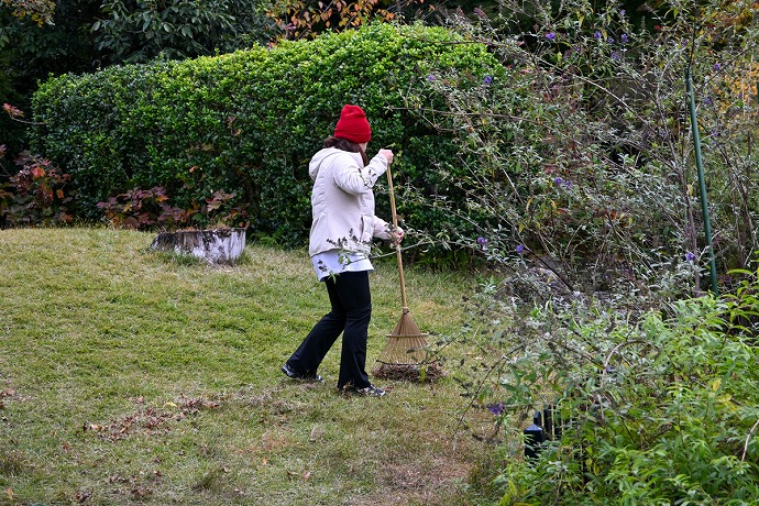 ウッドデッキの向こうに落ち込んだ落ち葉を集めて下さるママ。ギボウシも黄色くなりました。