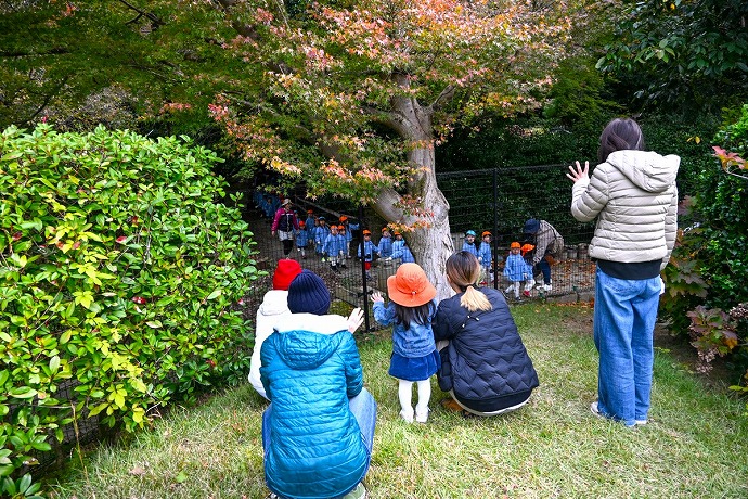 そこへ賑やかな声が…。ふり返ると森から戻ってきた年中少クラスがのみんな。「おかえり~~👋~」Fちゃんも手をふります👋Mちゃんも見つけたかな?