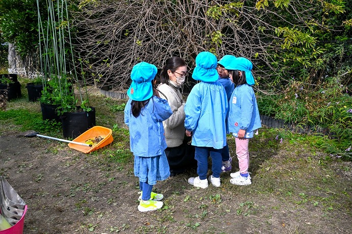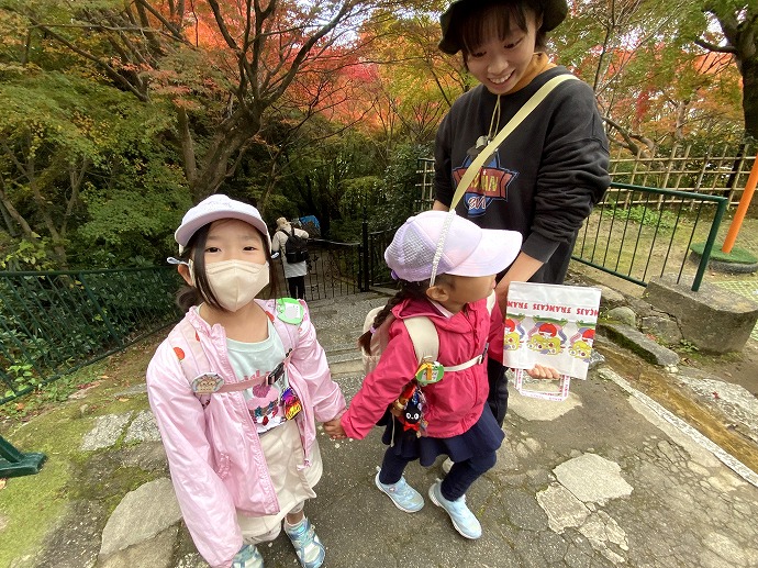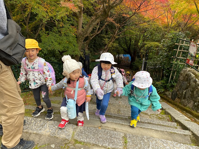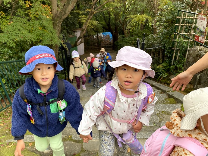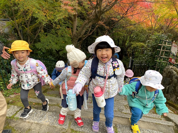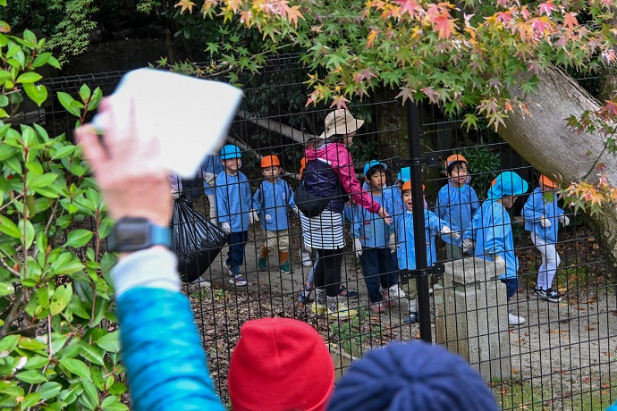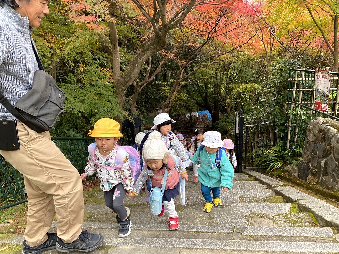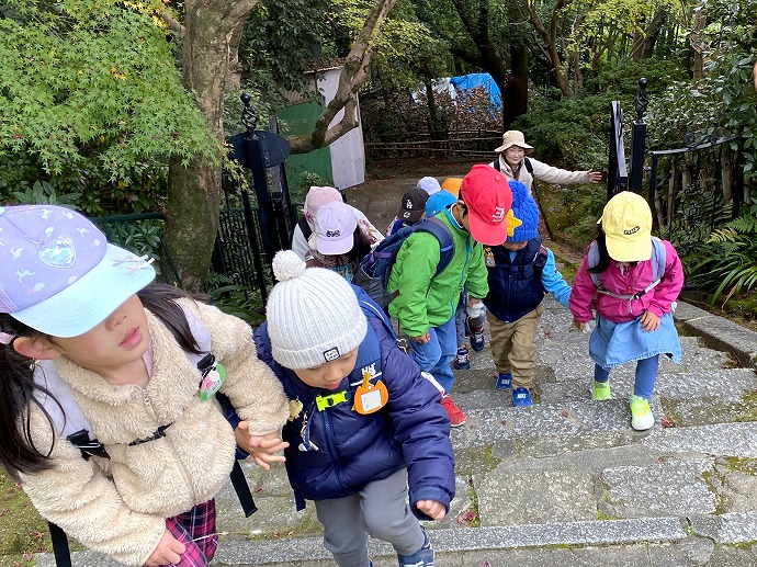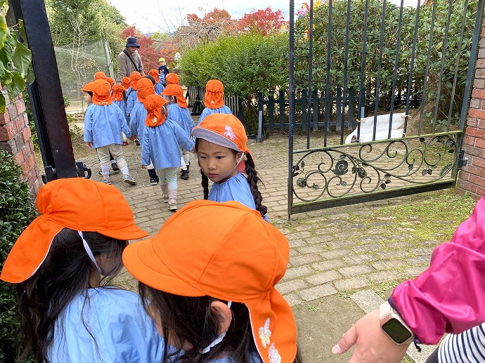 年少クラスがひみつの庭で過ごした後はそろそろお弁当🍱。園舎に戻ります。