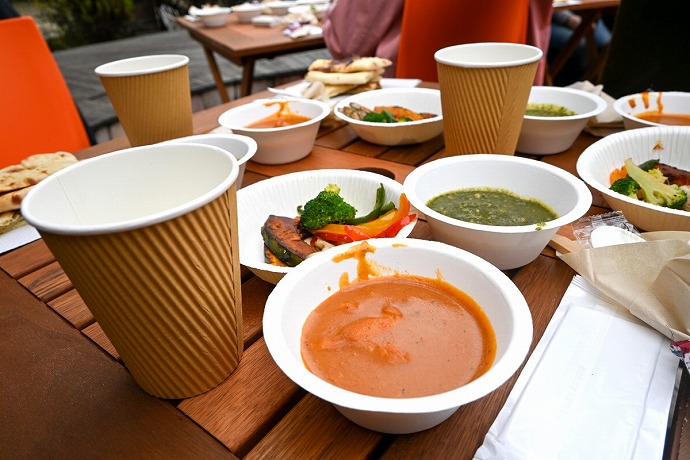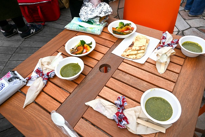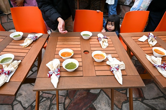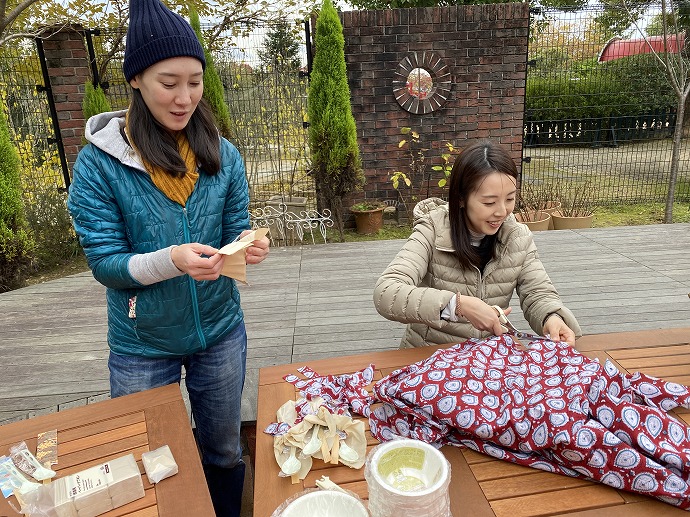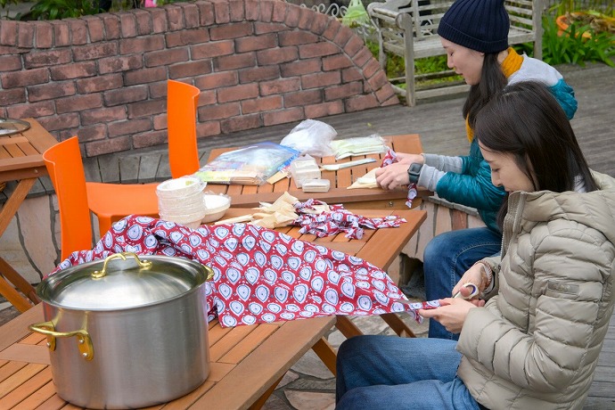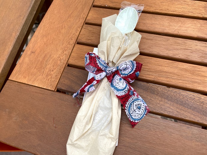 インド綿風の生地をカットするママ達。スプーン、お箸を紙ナプキンで包んだ上からカットした布でリボン包み。とても素敵!インドcurryだからインド綿でムードを添えられたらとのこと✨