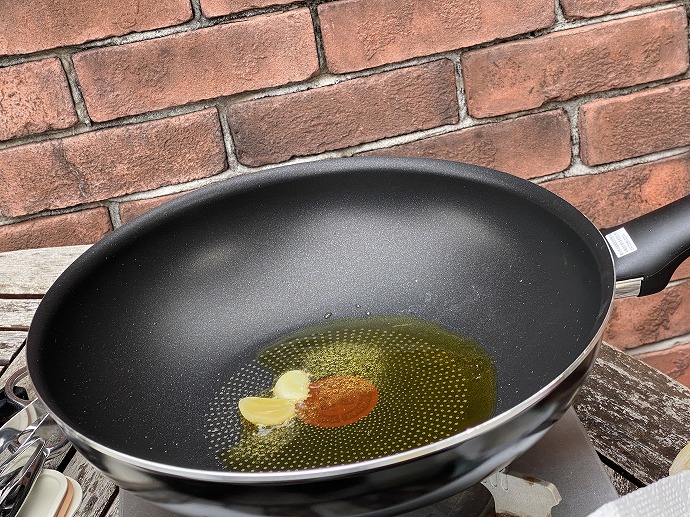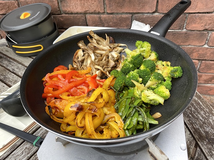 パプリカの鮮やかな色合い、マイタケやカボチャのスライスなどをオリーブオイル+ガーリック片で風味をつけて。