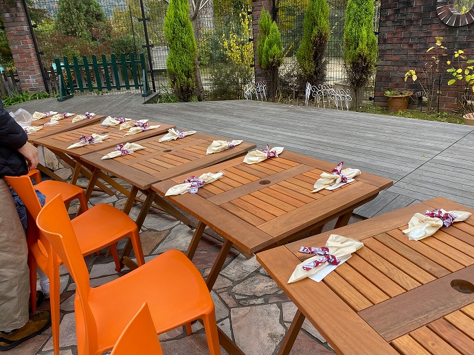 過去のママの日specialはひみつの庭の奥で行いましたが、今回はいつもママ達と活動後にお茶をしている壁泉で。ウッドデッキ縁と向かいのチェアに着席するアイデア✨
