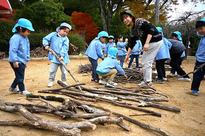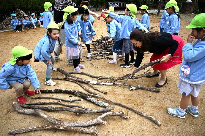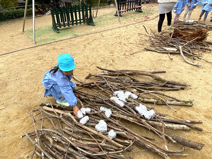 先に来ていた年長クラスが太めの枝を選んで並べていきます。