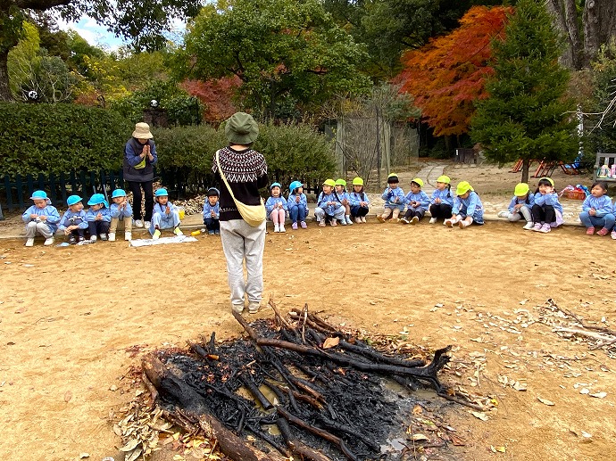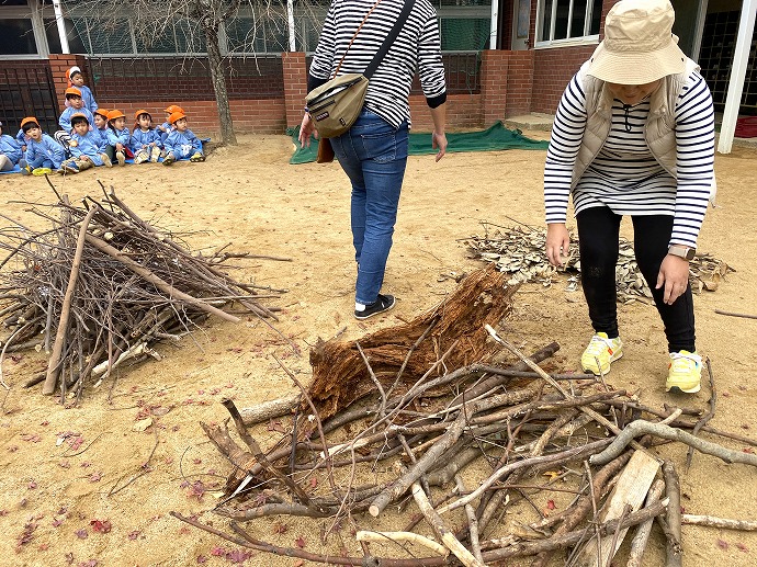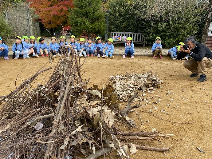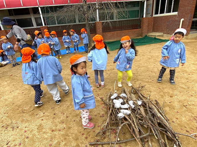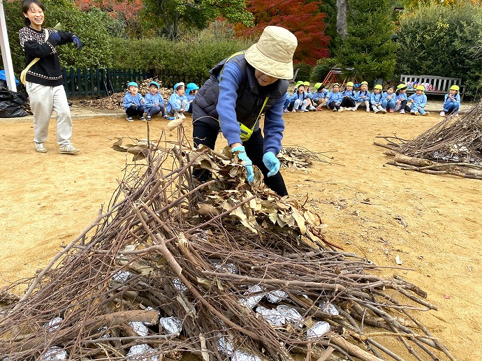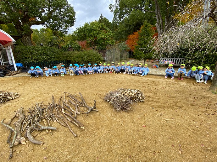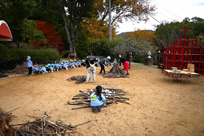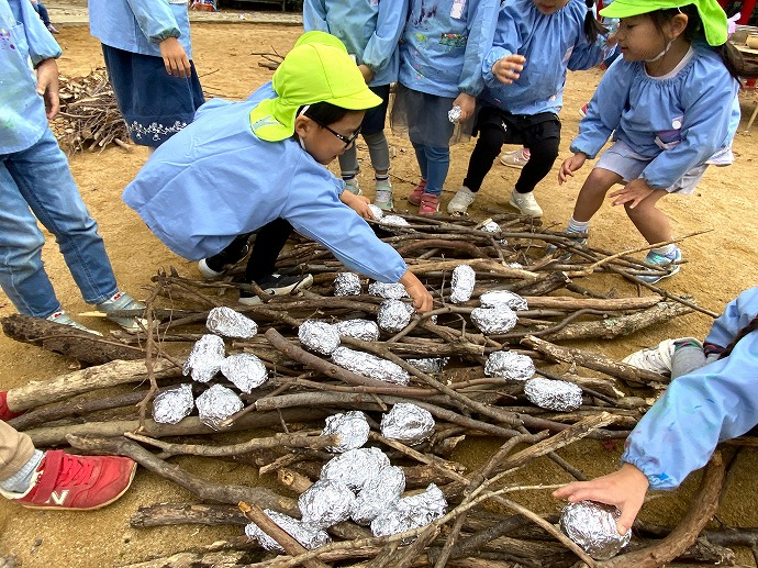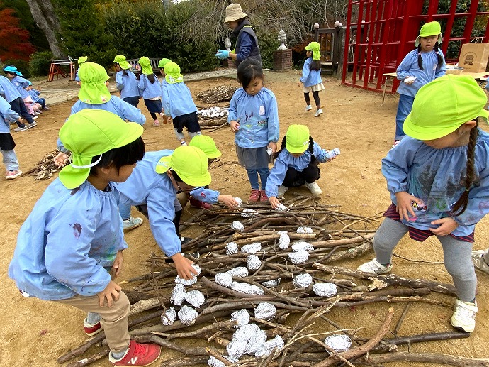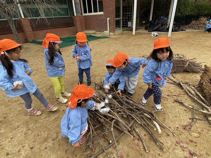みんなで集めてきた森の枝、落ち葉を使ってこれからお楽しみの焼き芋🍠をします。数点のお約束を確認した後、お芋を並べた木の上に置いていきました。年少、年中、そして…