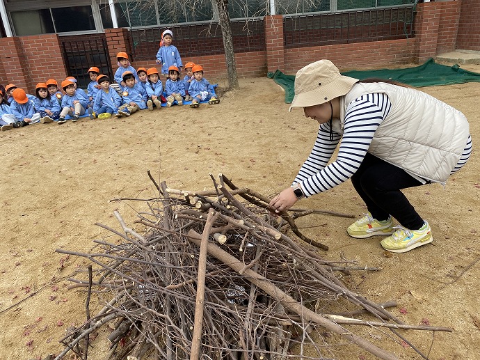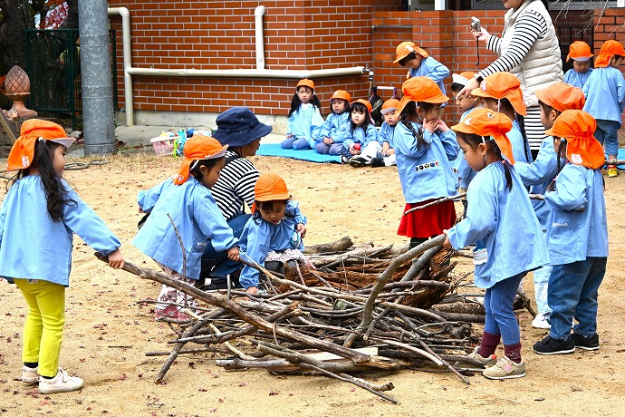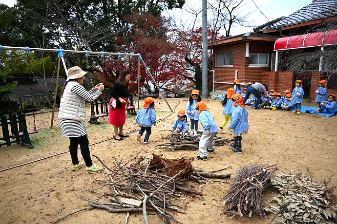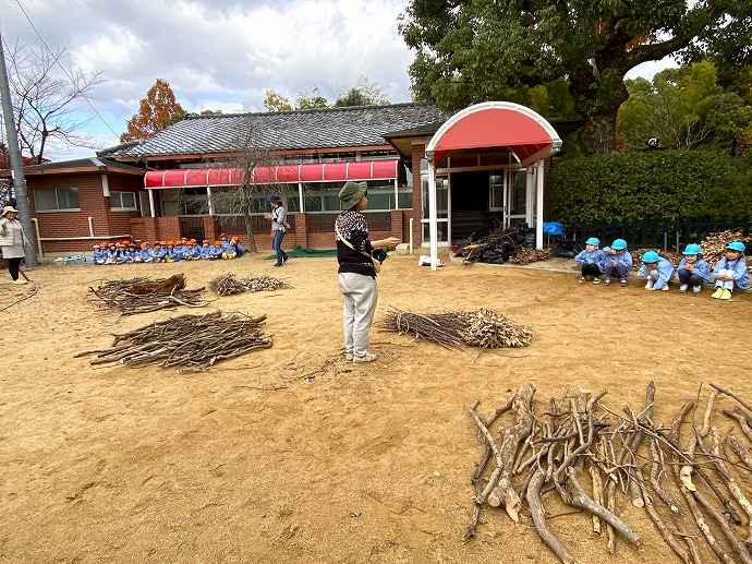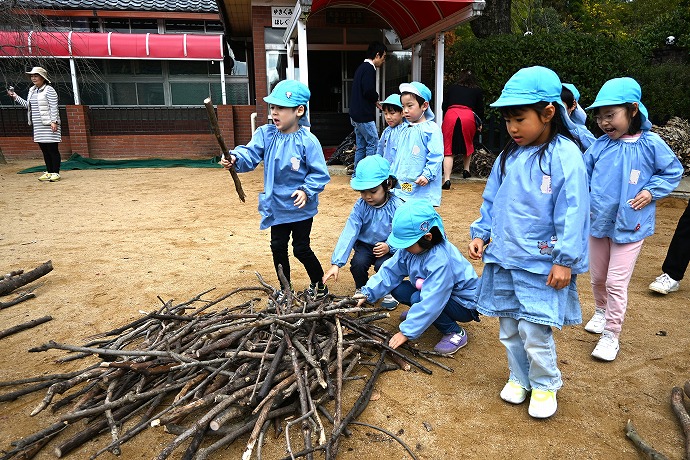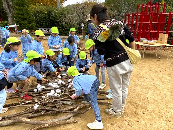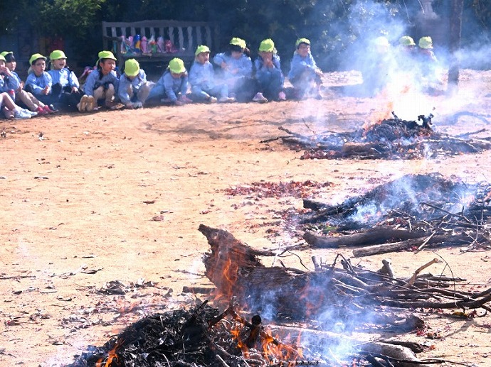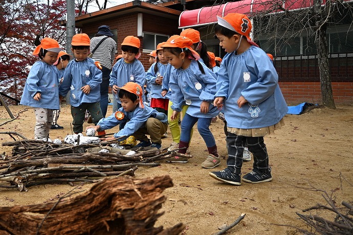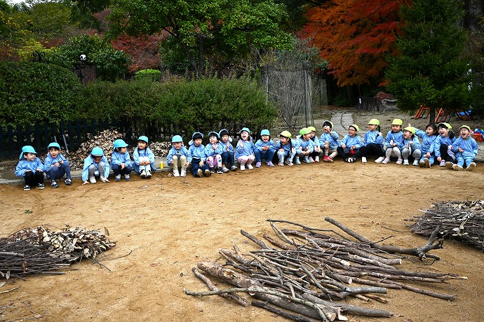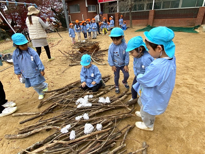 みんなで集めてきた森の枝、落ち葉を使ってこれからお楽しみの焼き芋🍠をします。数点のお約束を確認した後、お芋を並べた木の上に置いていきました。年少、年中、そして…