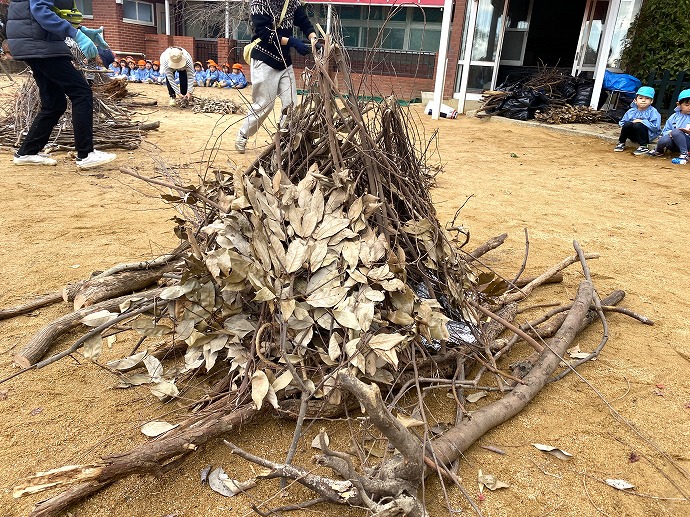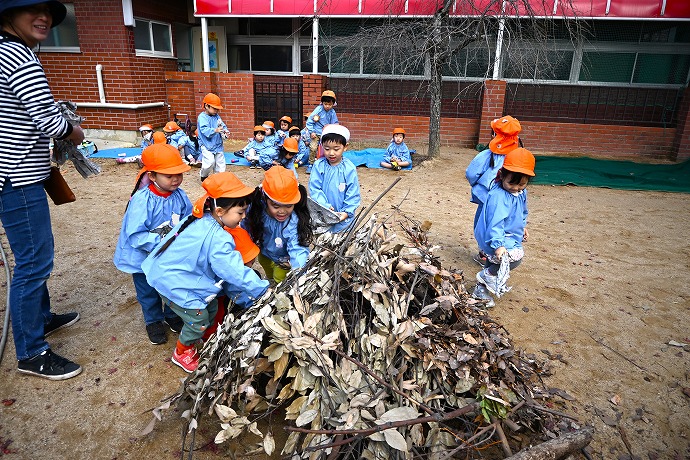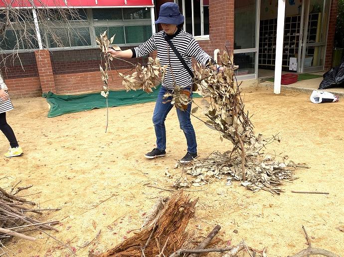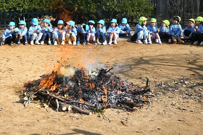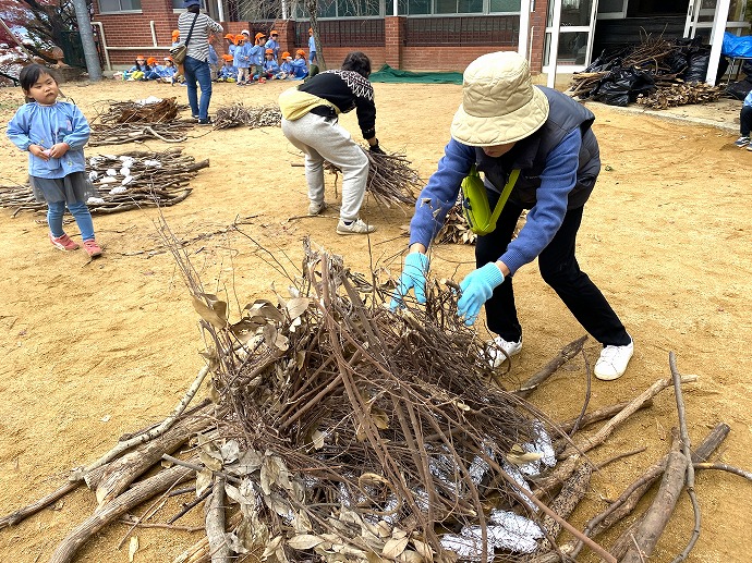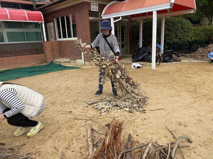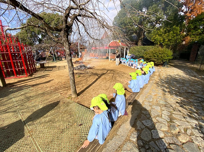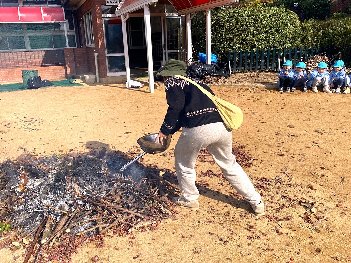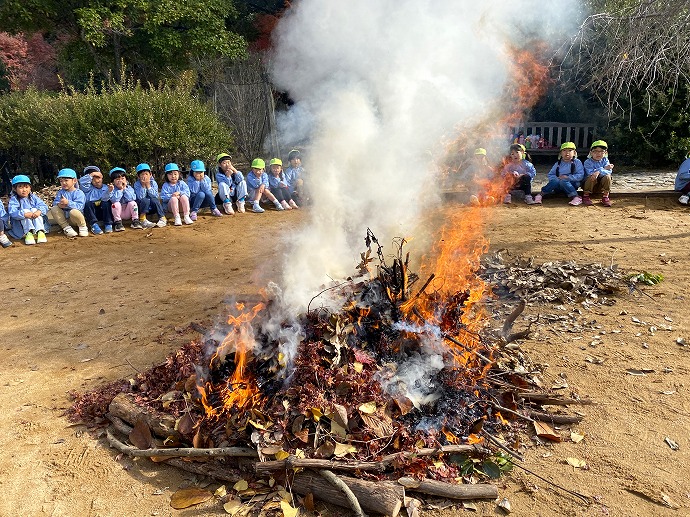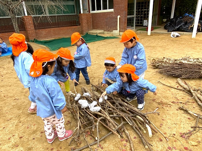 前日は夕方から雨が降りました。枝木にブルーシートを被せたり、園舎内に取り込んだお陰で落ち葉は湿気る心配もなくよく燃えてくれました🔥