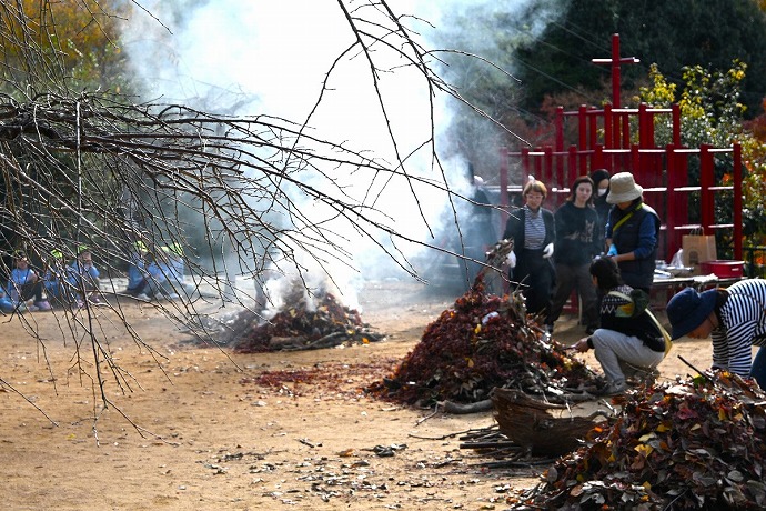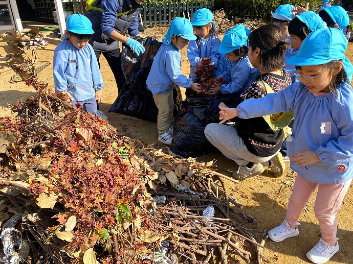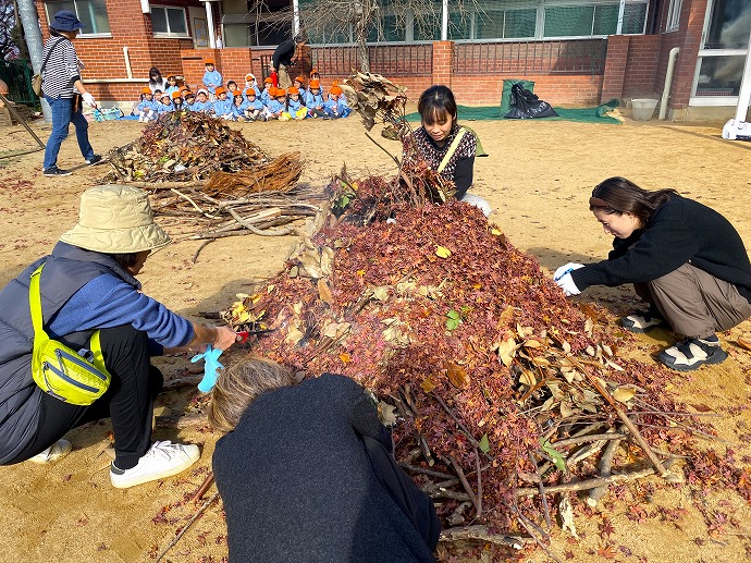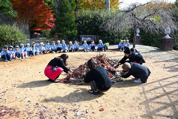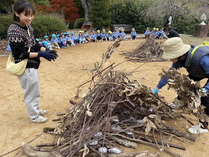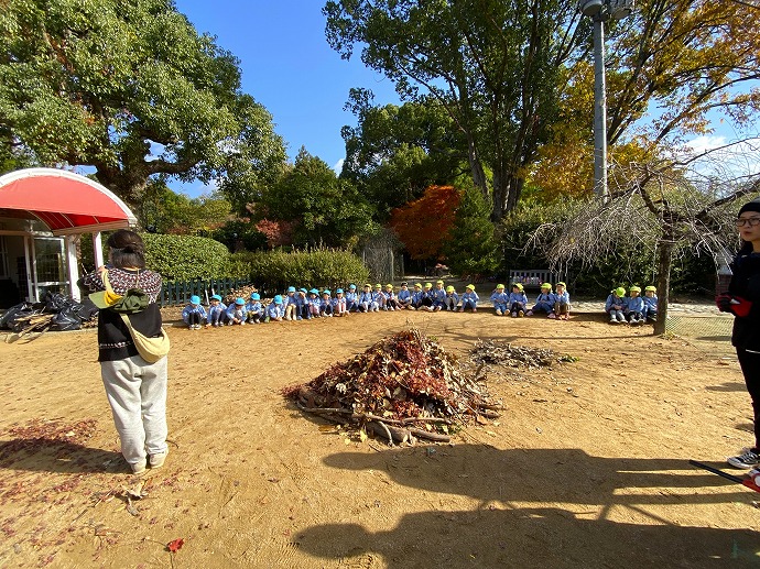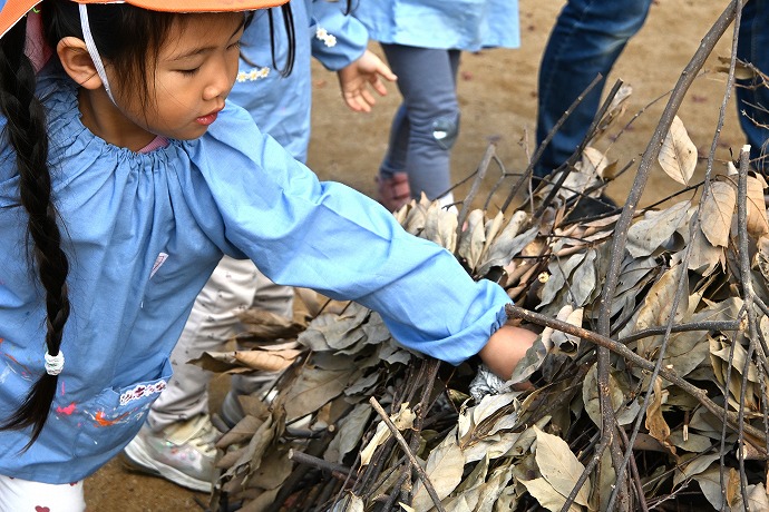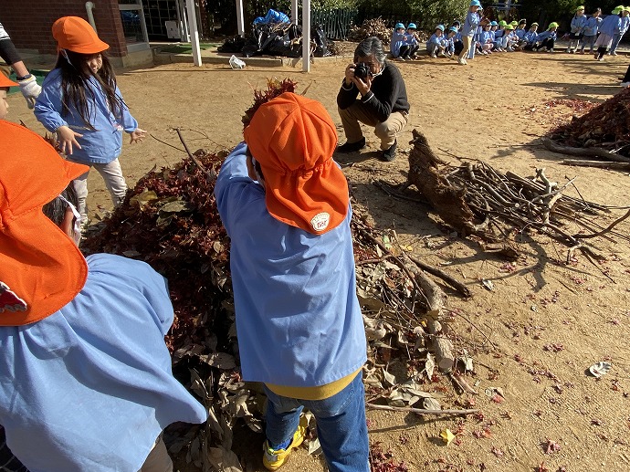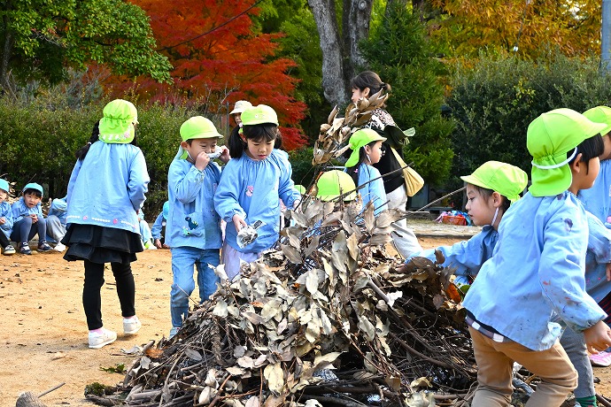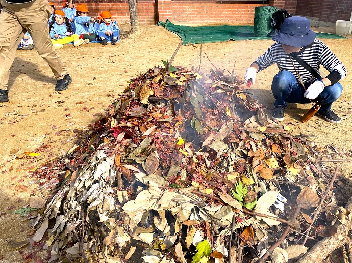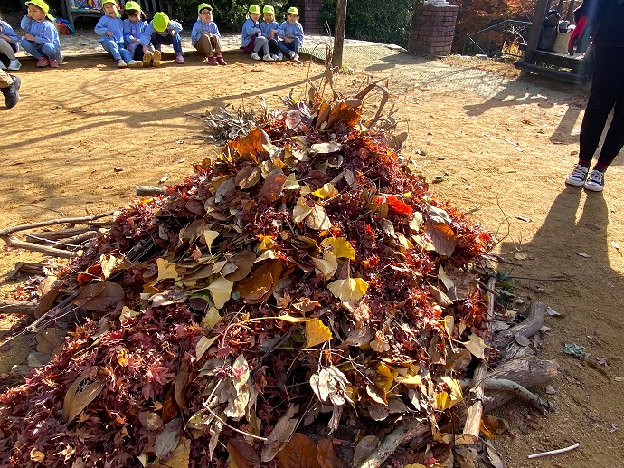 落ち葉たっぷりの年少さんのお山にも着火🔥