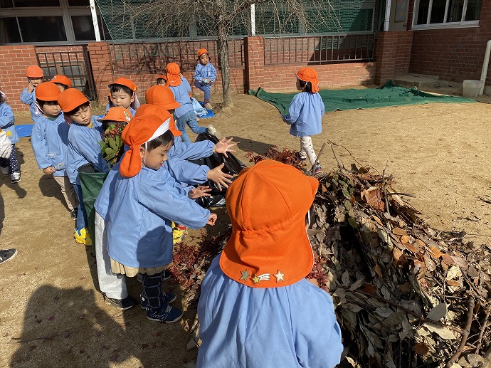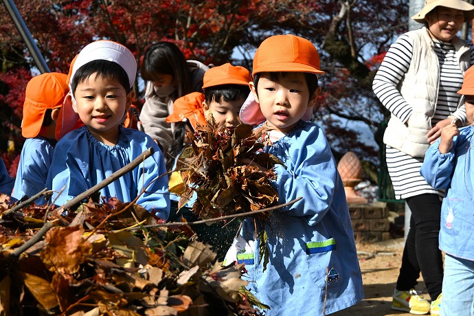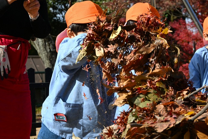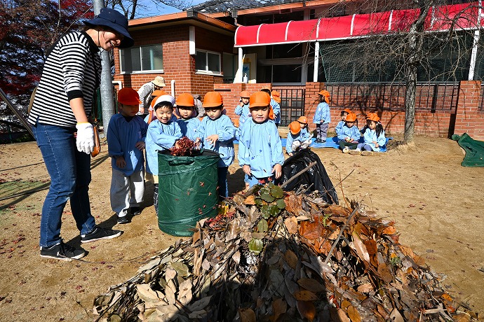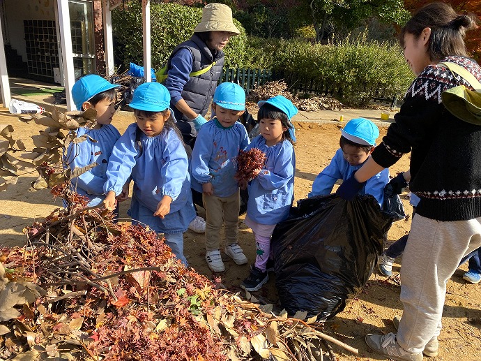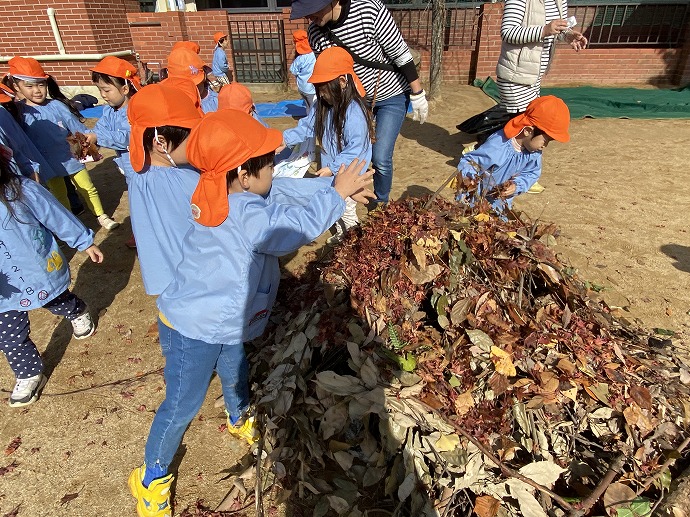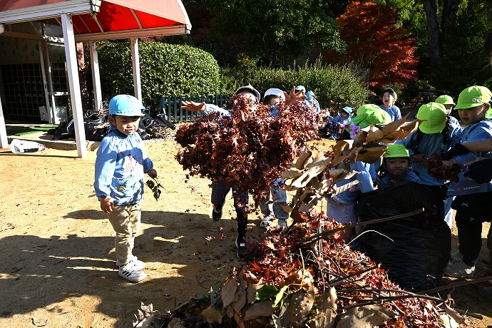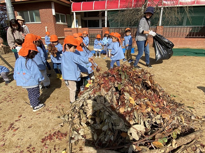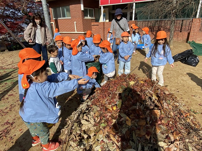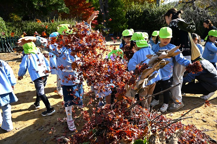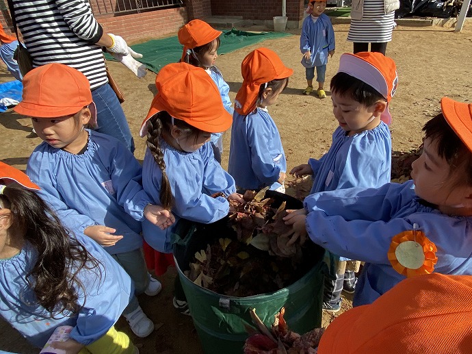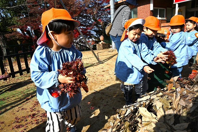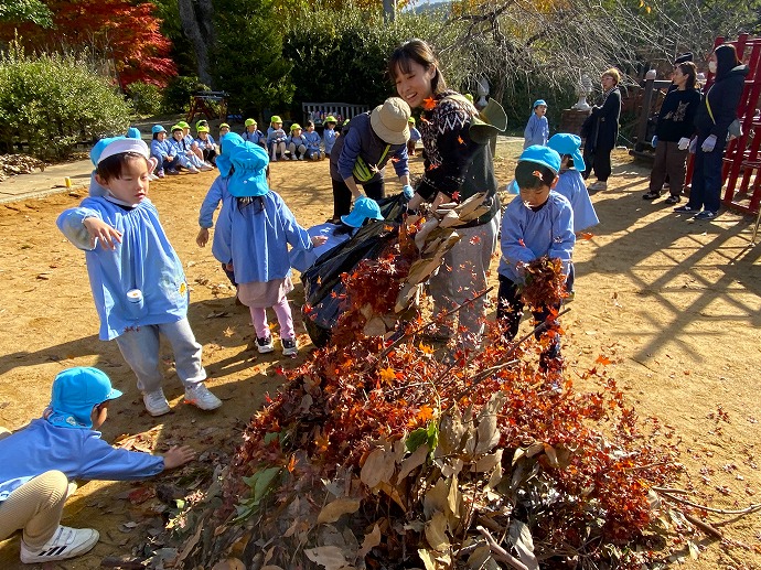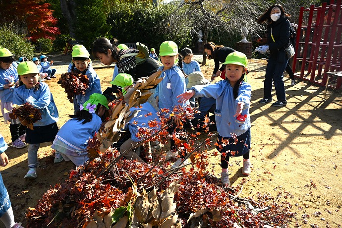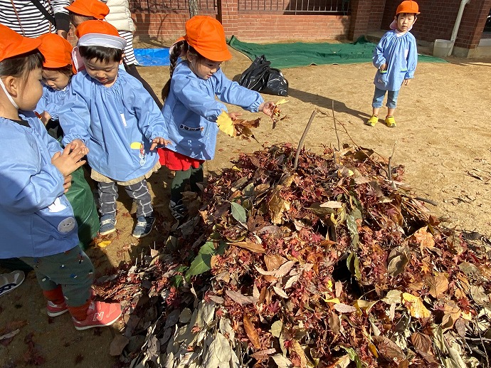年中さんがモミジ、コナラ、モクレン、イチョウなどいろいろな落ち葉をお山にかけてあげます。