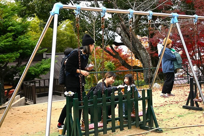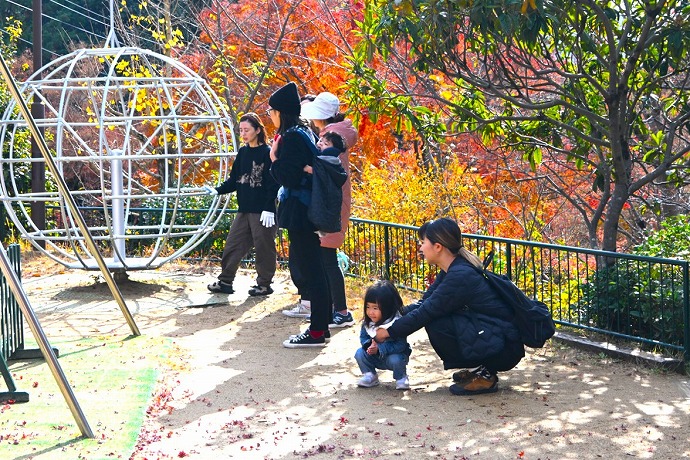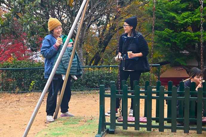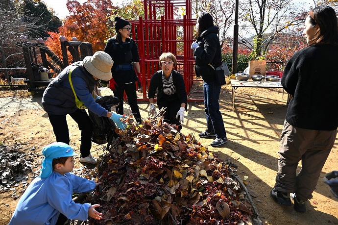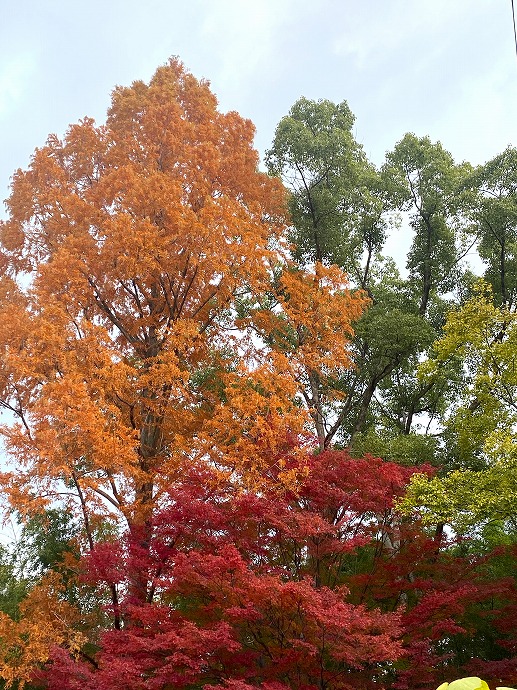 背景のモミジ紅葉、イチョウが鮮やかな晩秋の一日🍂 子どもとともに皆さんでご一緒しました。