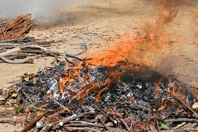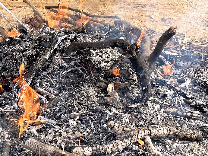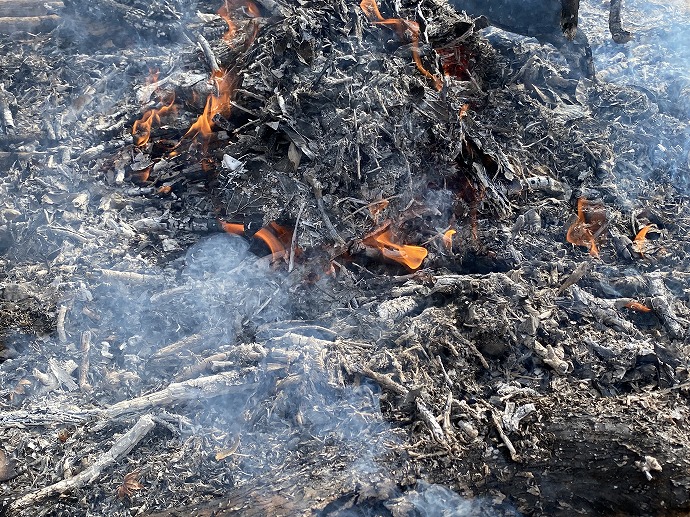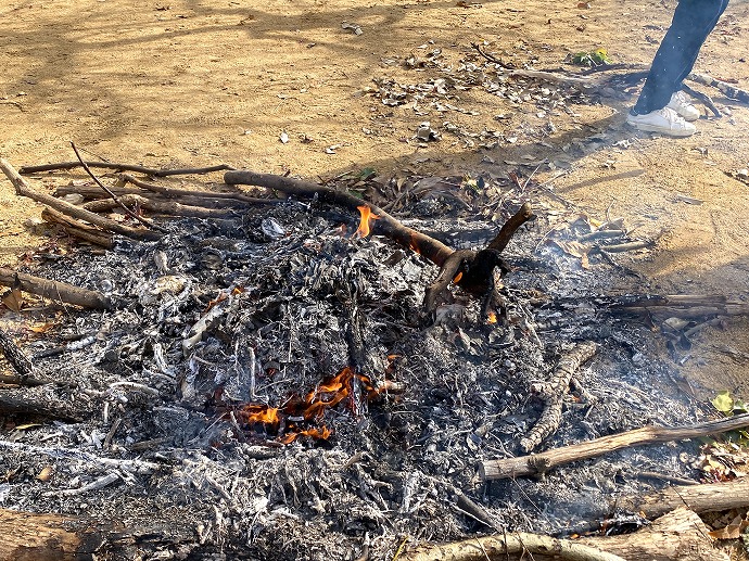 炭になった森の落ち葉や枝葉。園内で剪定した樹木の束もよく燃えてくれましたね🌳