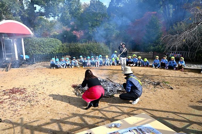 それではみんなでつくったお芋の焚き木にこれから火をつけ、いよいよ焼き芋をはじめます。大きな火になり煙も来るかも知れないから数点のお約束を交わしてスタートします。