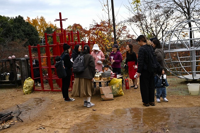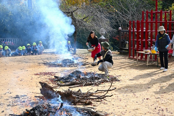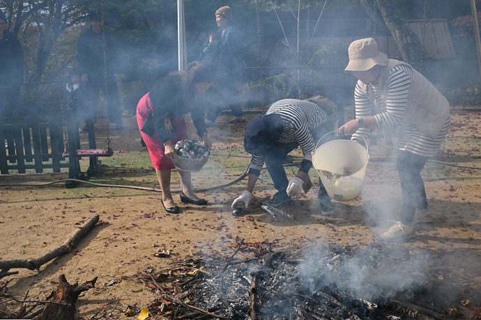 焚き火の周りは熱いのでママ達に手伝ってもらって。