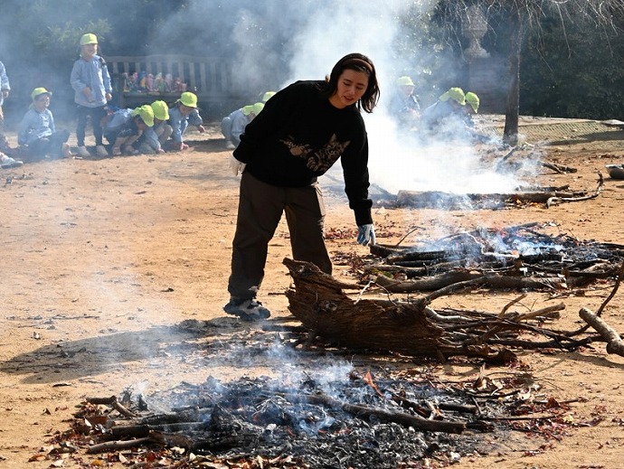 晴天に恵まれ、園庭に三つの焚き火ができました🔥