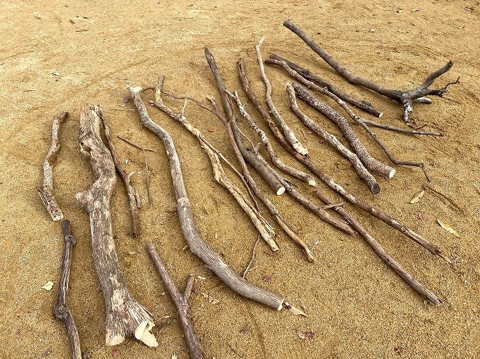 集めた薪を地面に並べてみます。お芋全体に火が通るように安納芋を木の上に置くための準備です。