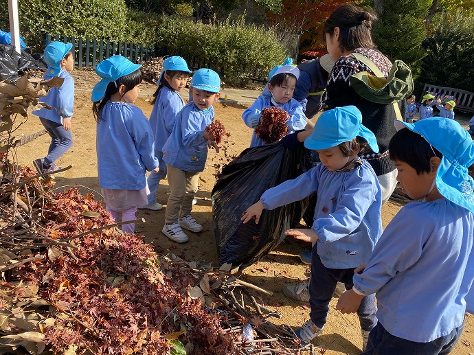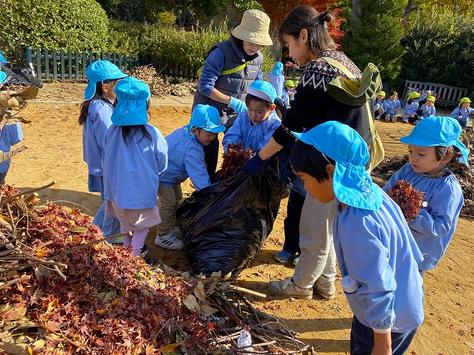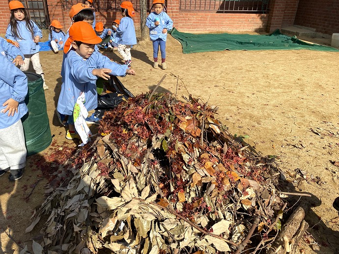 まだある~! 落ち葉入れに入った山ほどの園庭の落ち葉🍂🍂