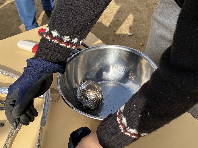 まず、先生からお芋をホイルに巻いたものを一つずつもらっていきます。