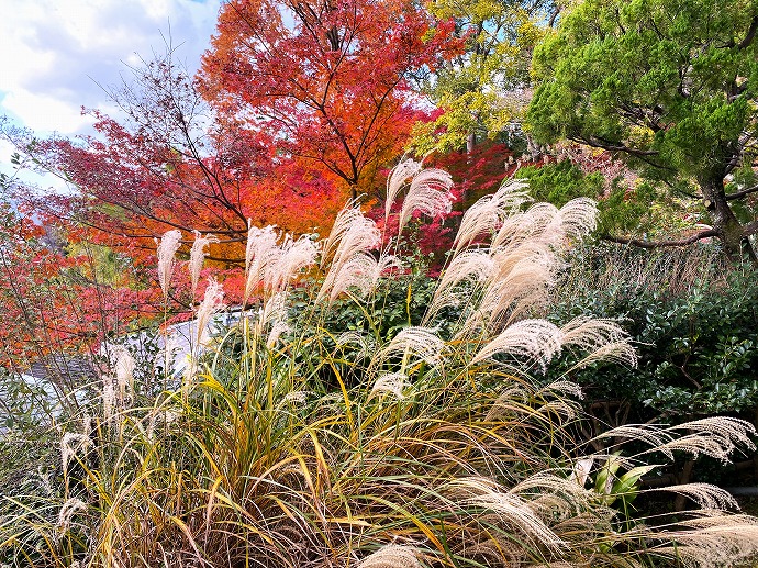 午後のたんぽぽぐみ園舎前。もみじ紅葉をバックにススキの花も満開になりました🍁