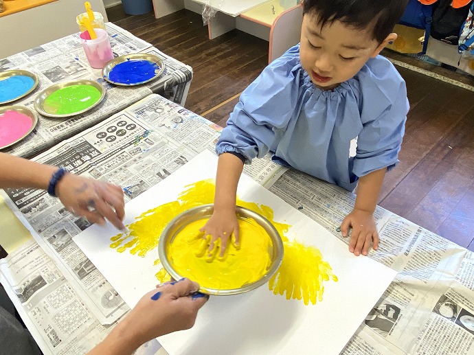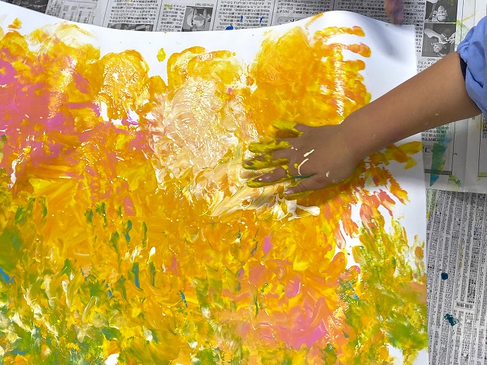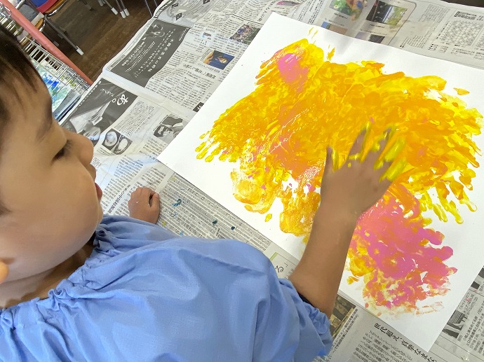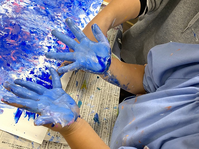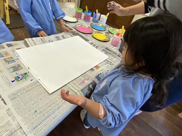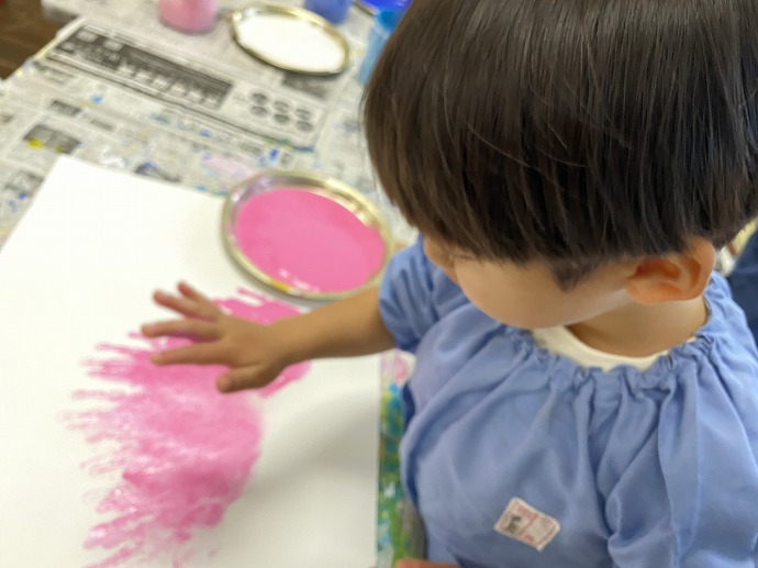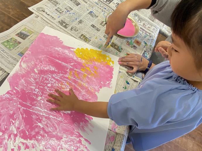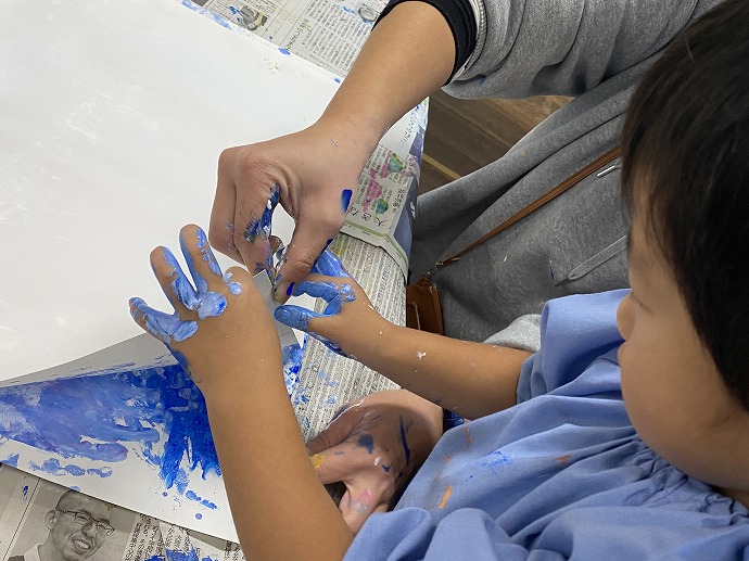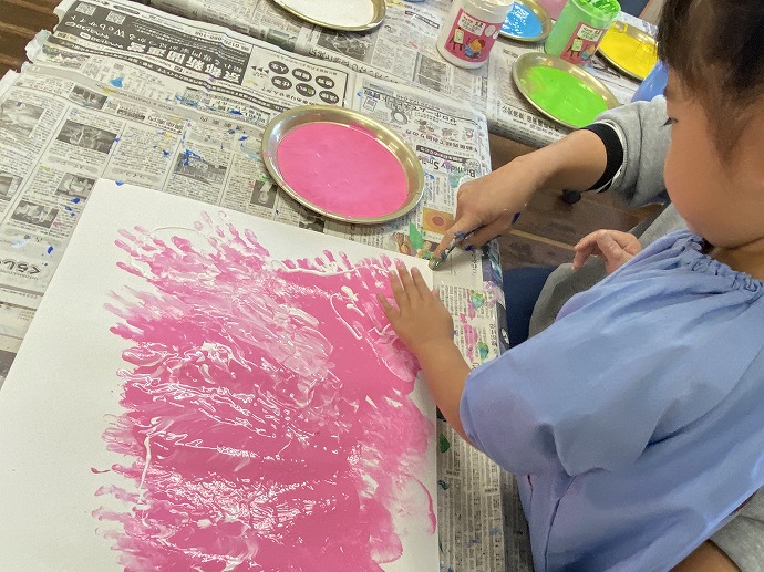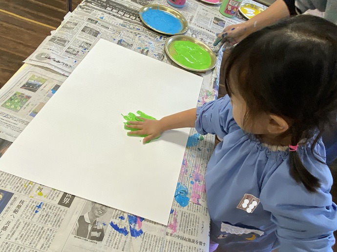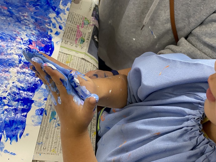 まず四つ切画用紙を前に、好きな色を選んでハンドペインティング✋をするIちゃん。