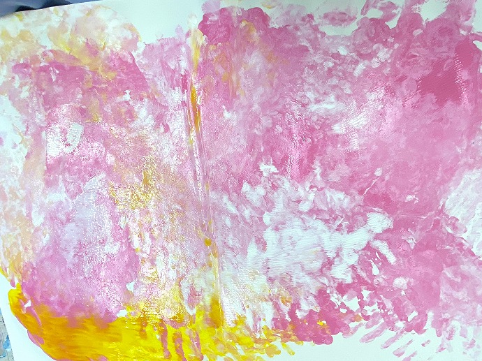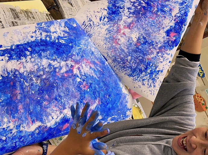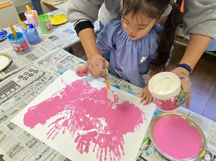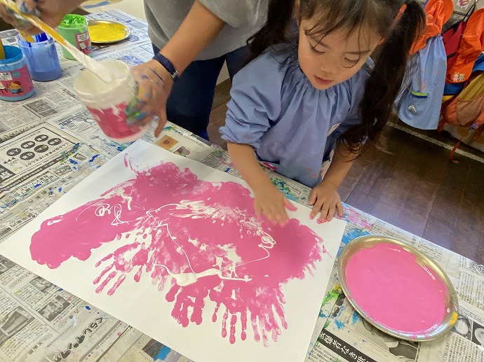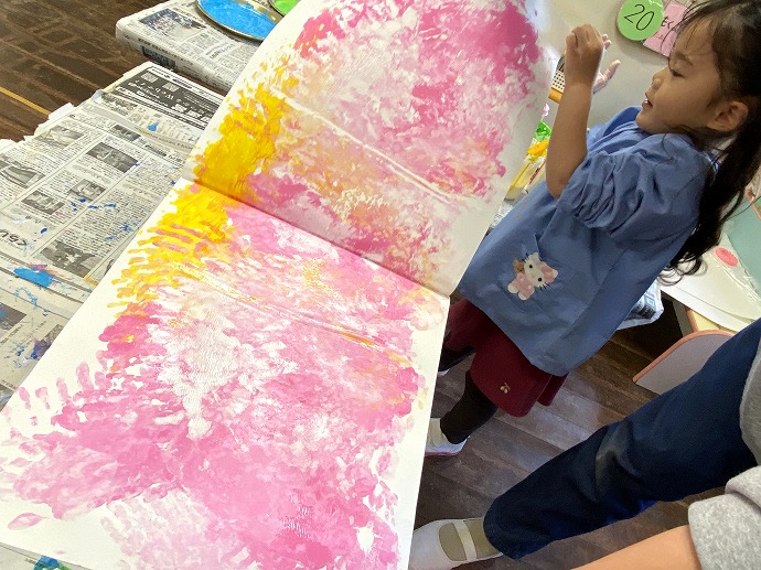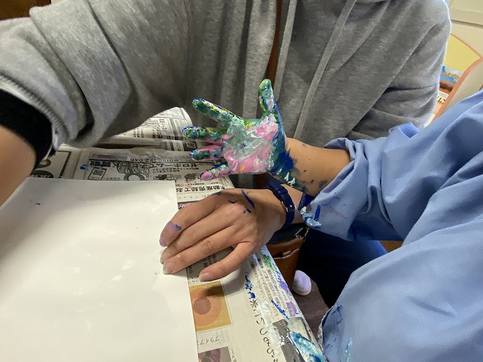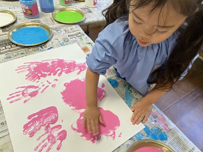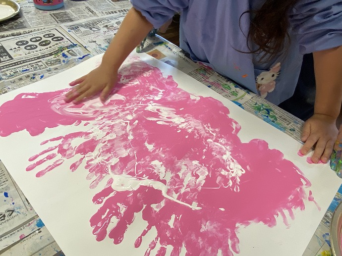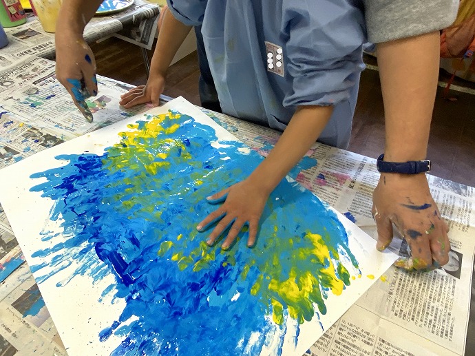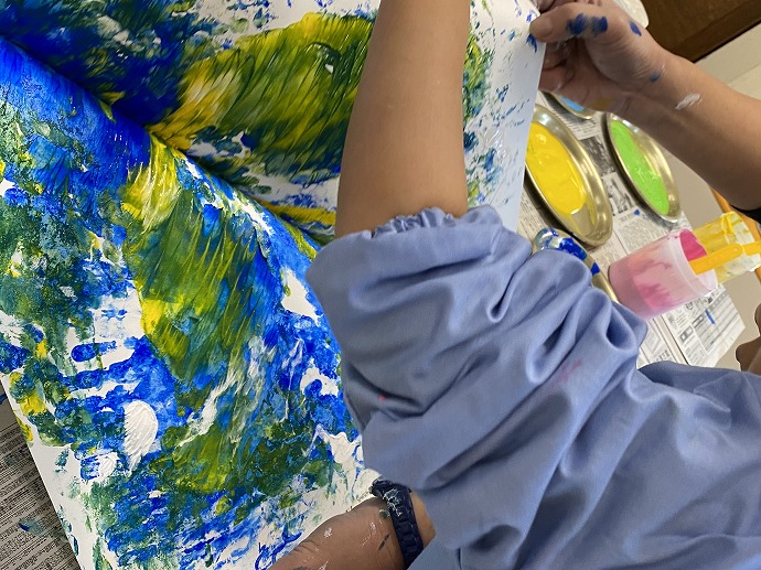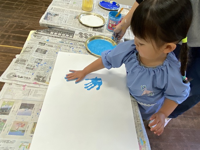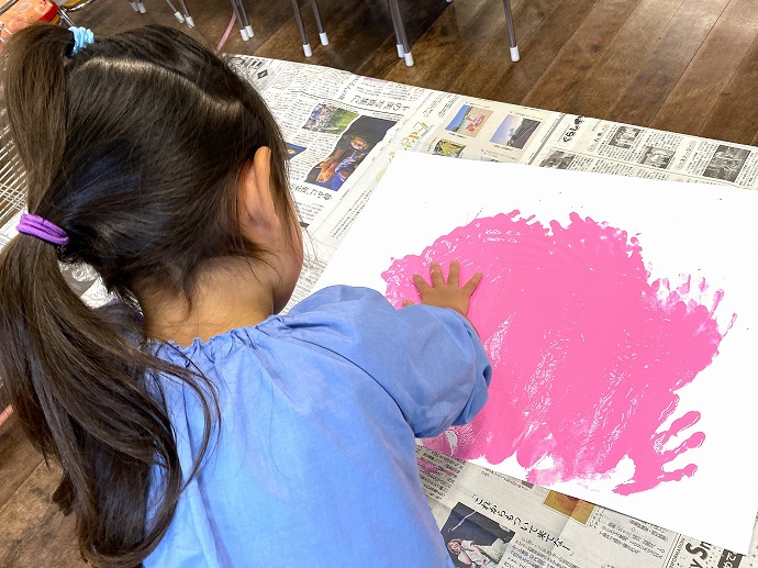 まず四つ切画用紙を前に、好きな色を選んでハンドペインティング✋をするIちゃん。