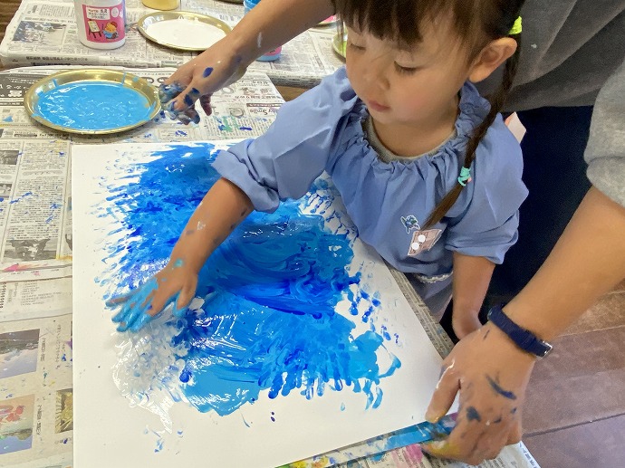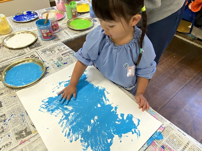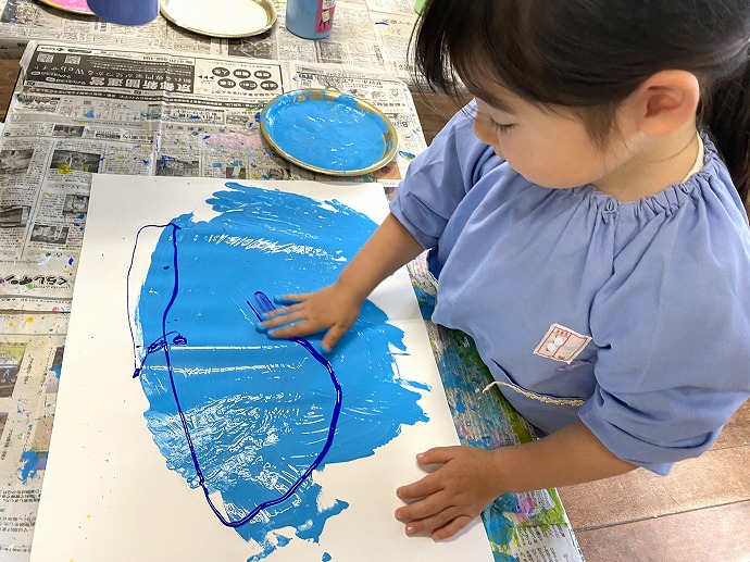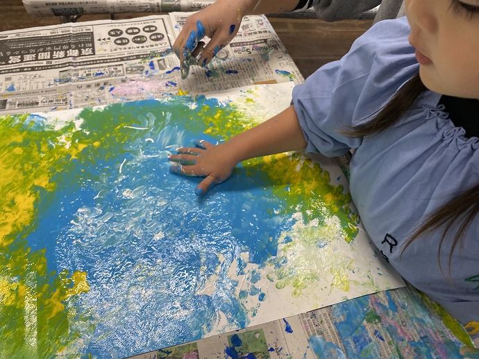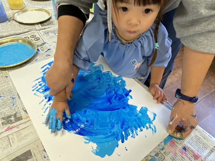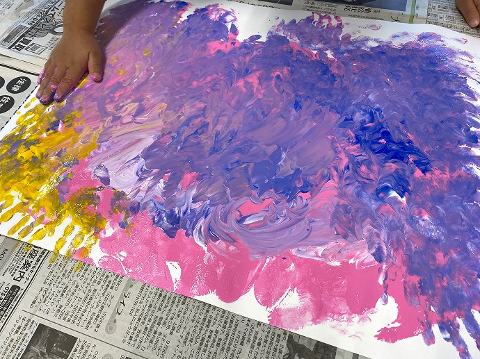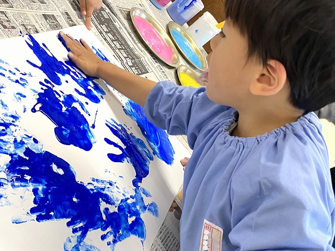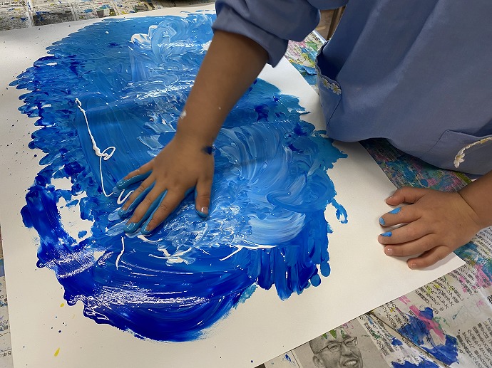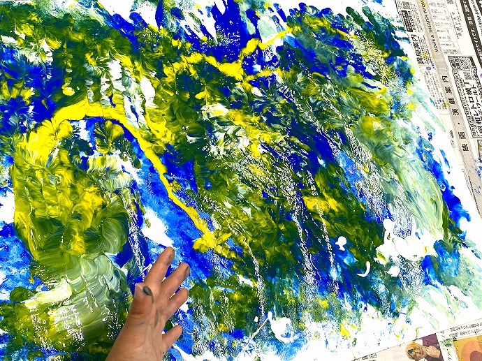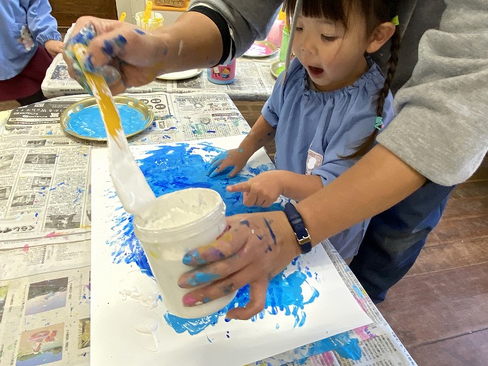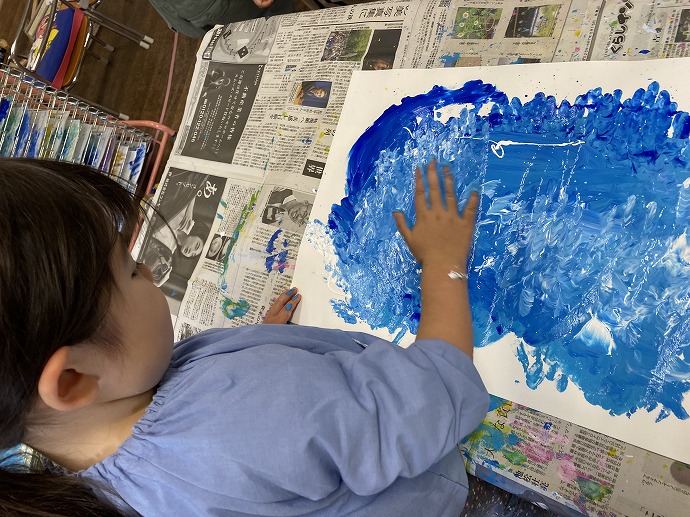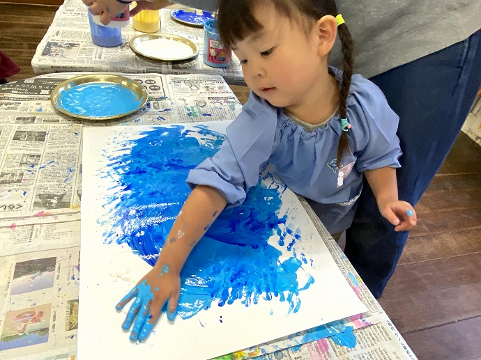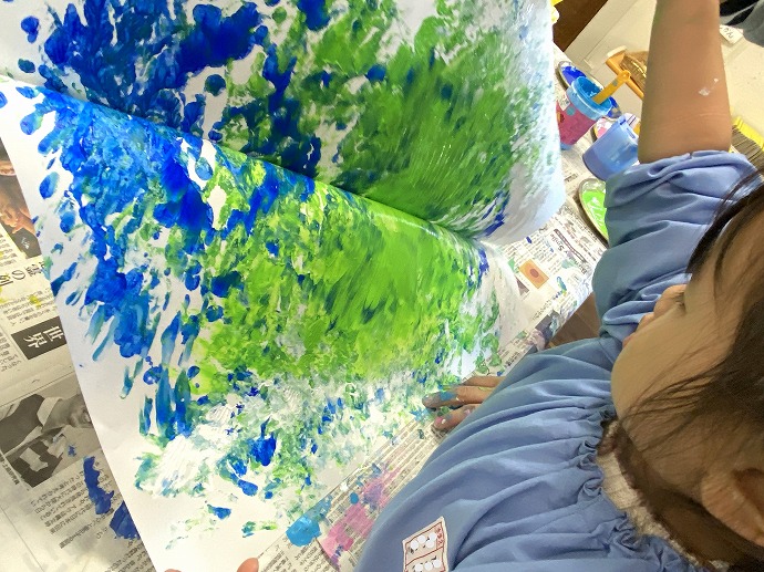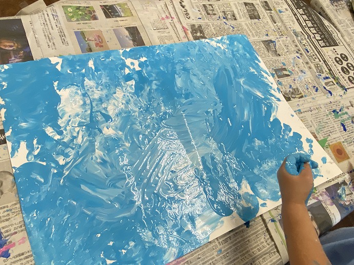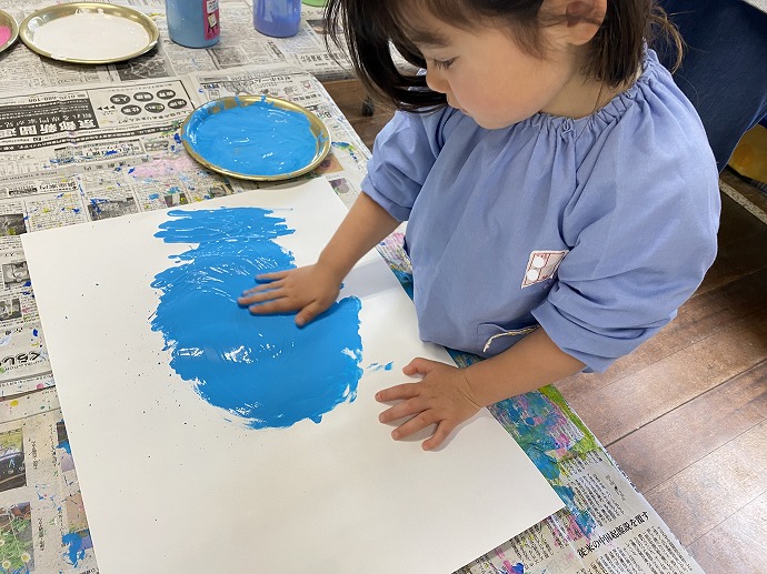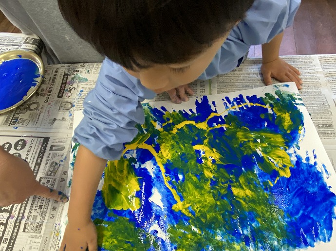 そこへ青色を選んで真ん中で混ぜてくるくる。絵の具に「糊」を混ぜているので伸びがよく、手の感触を気持ちよく楽しんでいます。「糊」を加えることは随分以前にtomomi先生と保育について話していた時、スライム遊びのように感触あそびも兼ねて気持ちよく取り組めるには?と考えついた方法です✨