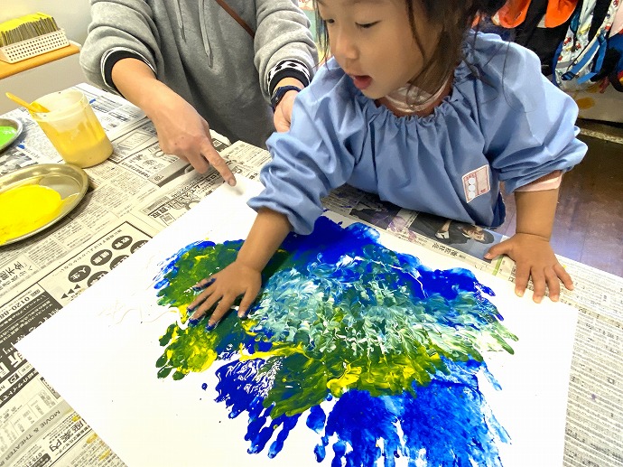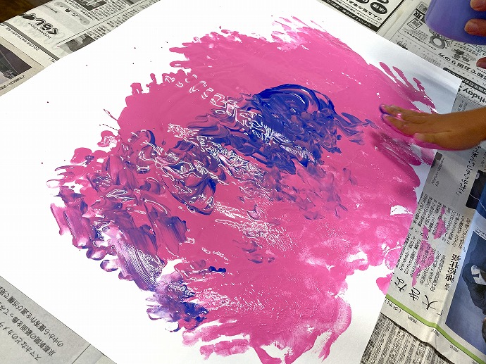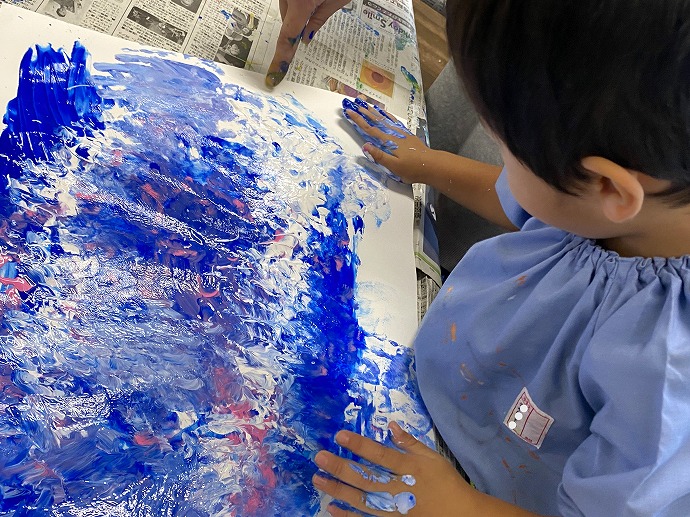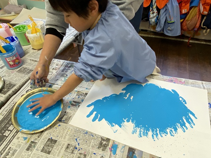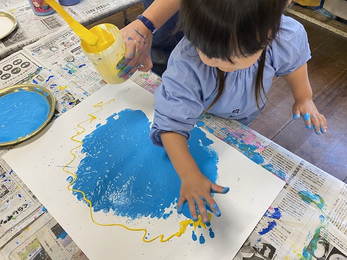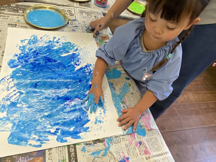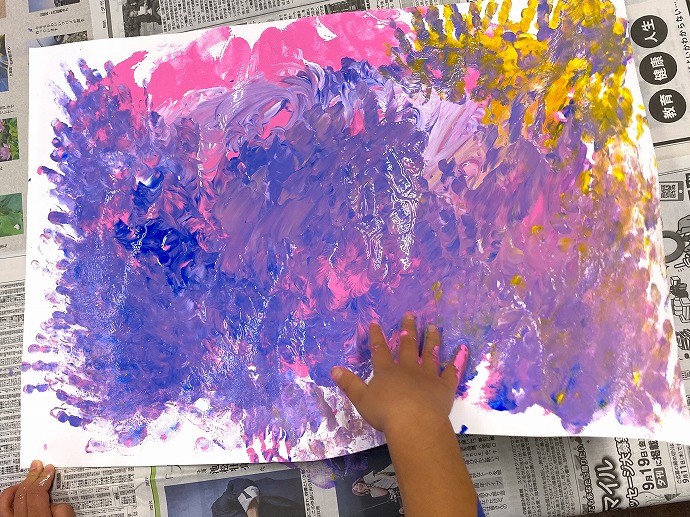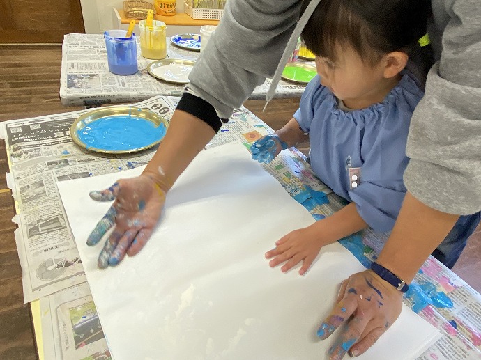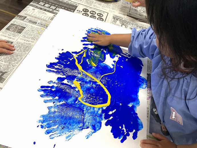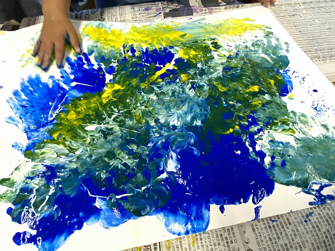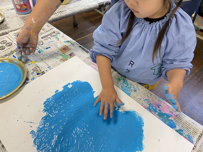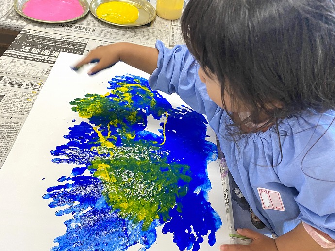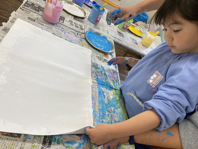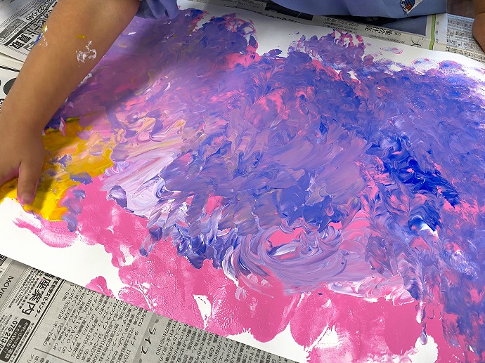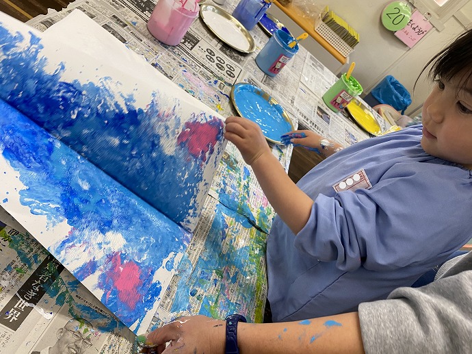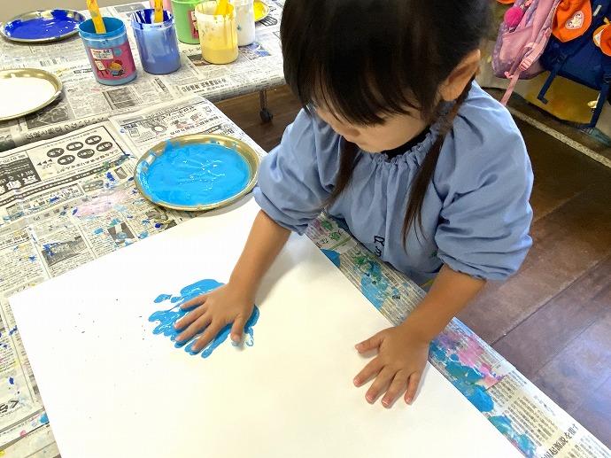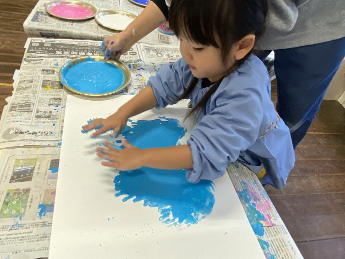 そこへ青色を選んで真ん中で混ぜてくるくる。絵の具に「糊」を混ぜているので伸びがよく、手の感触を気持ちよく楽しんでいます。「糊」を加えることは随分以前にtomomi先生と保育について話していた時、スライム遊びのように感触あそびも兼ねて気持ちよく取り組めるには?と考えついた方法です✨