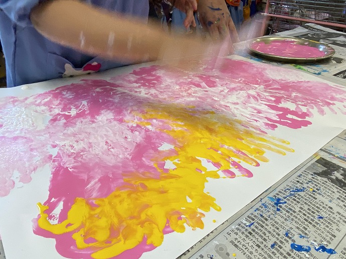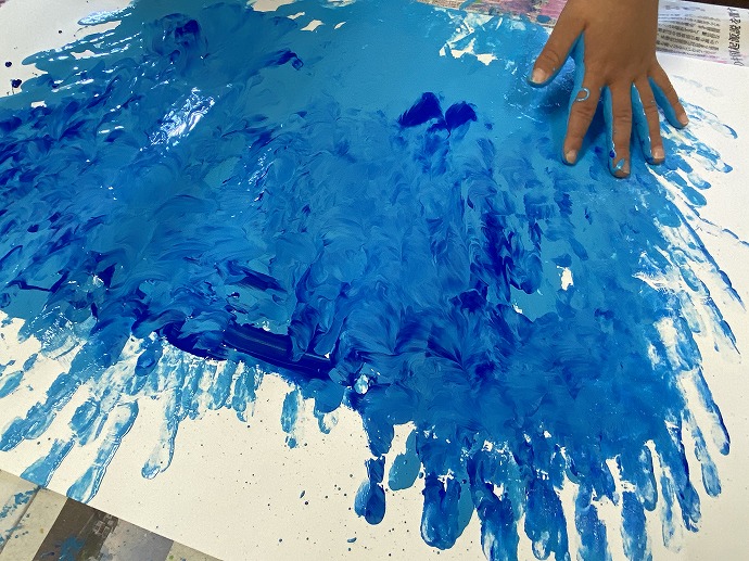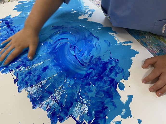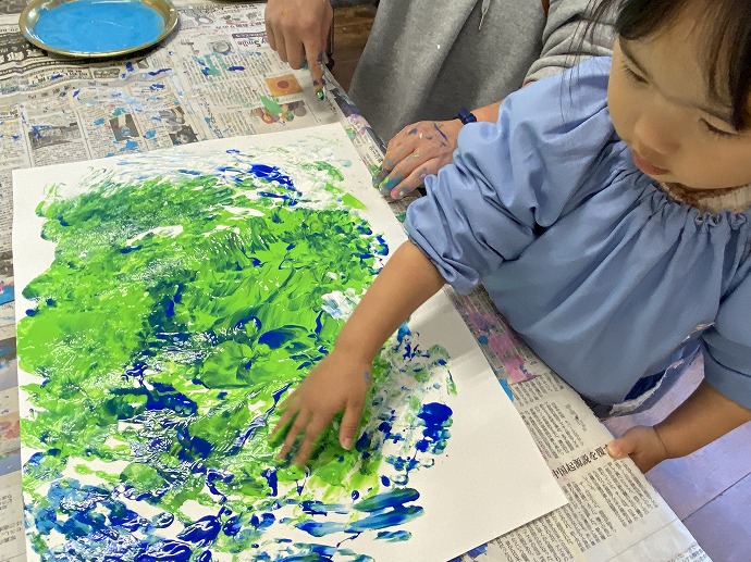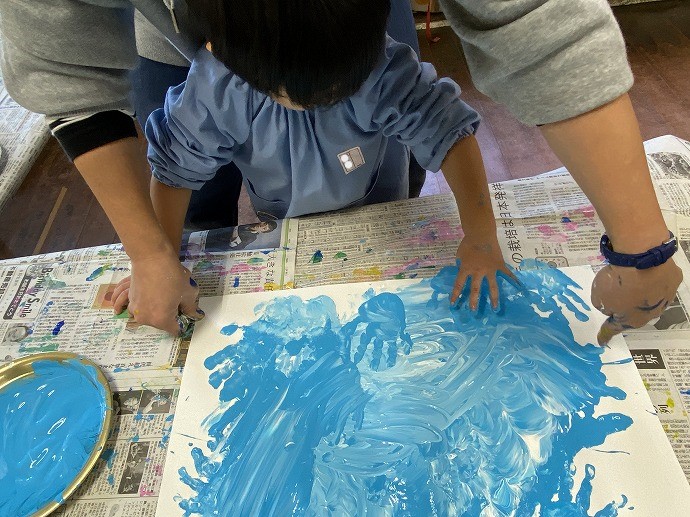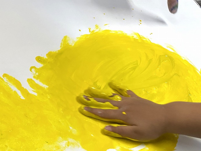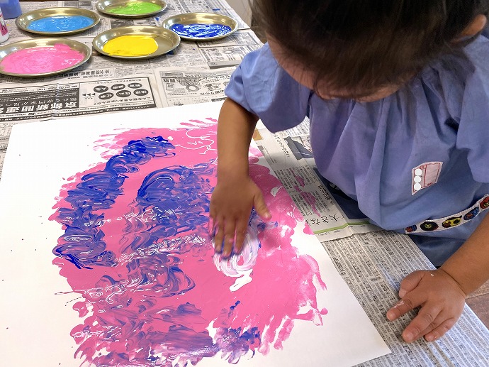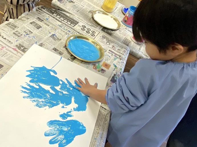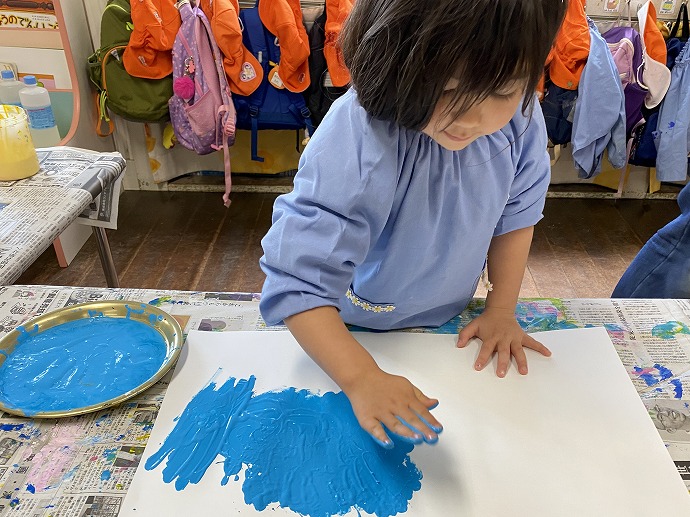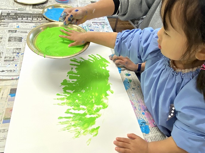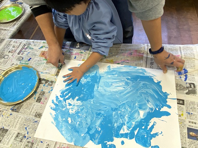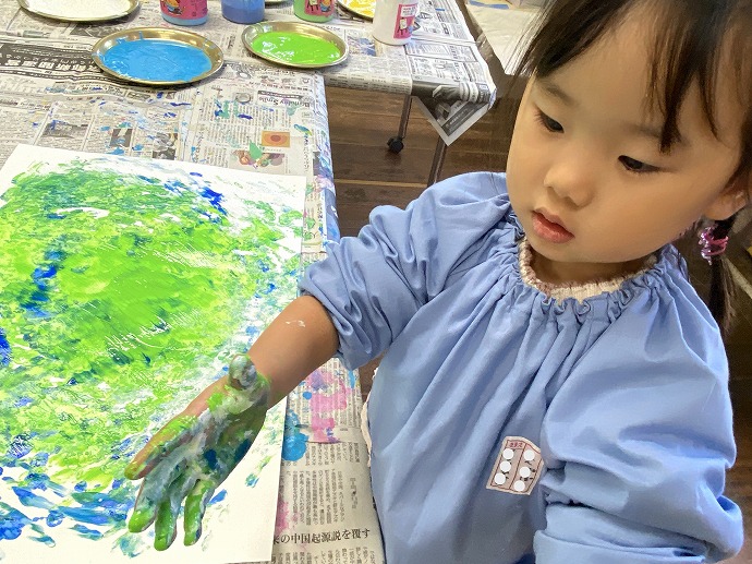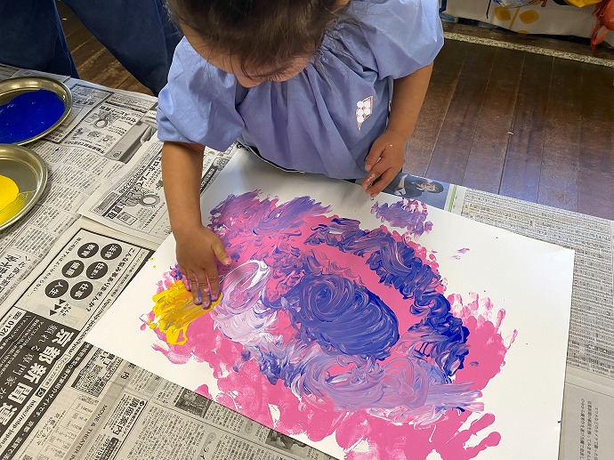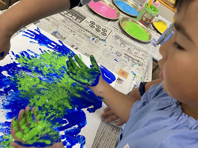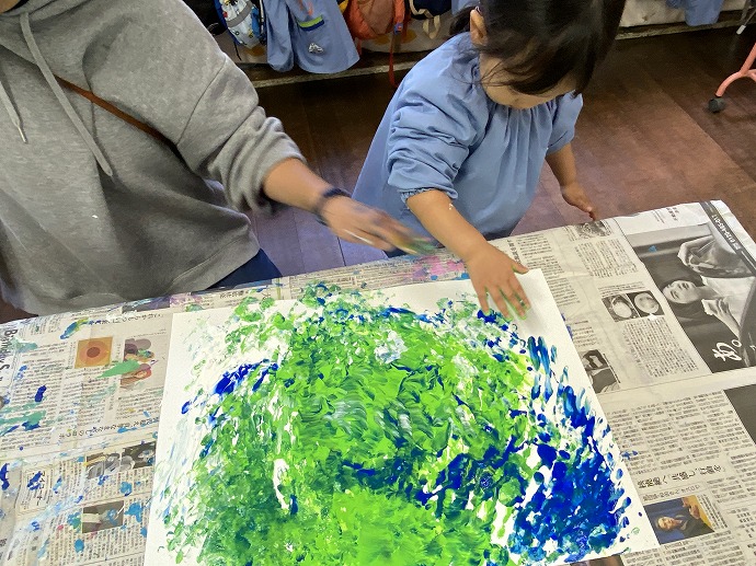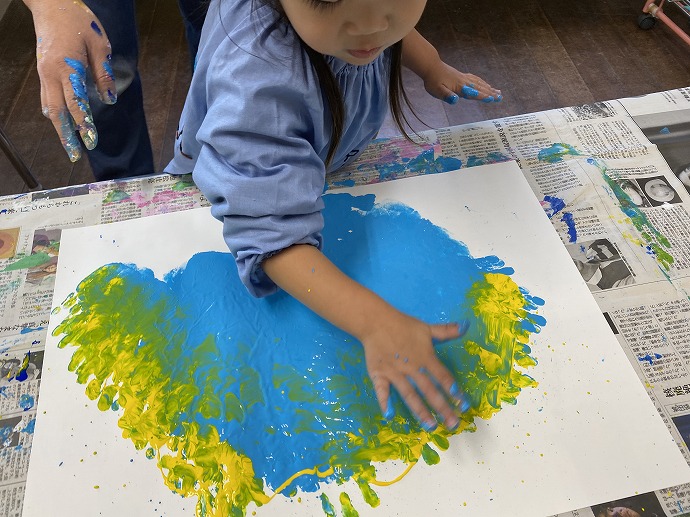 そこへ青色を選んで真ん中で混ぜてくるくる。絵の具に「糊」を混ぜているので伸びがよく、手の感触を気持ちよく楽しんでいます。「糊」を加えることは随分以前にtomomi先生と保育について話していた時、スライム遊びのように感触あそびも兼ねて気持ちよく取り組めるには?と考えついた方法です✨