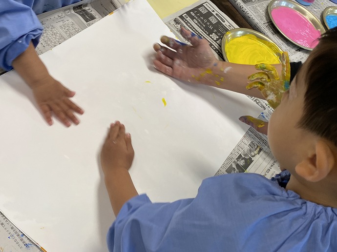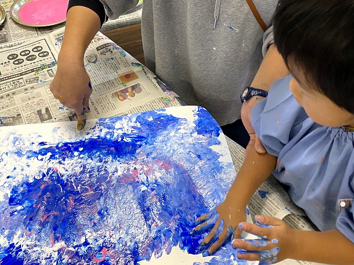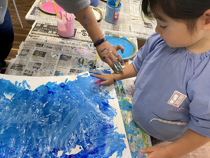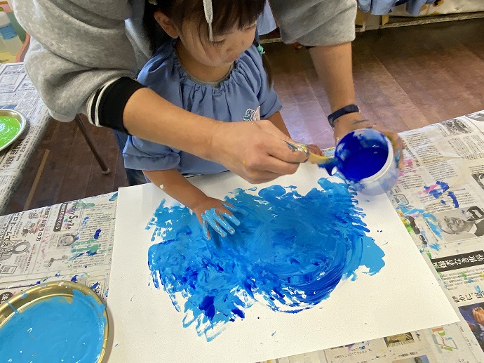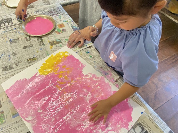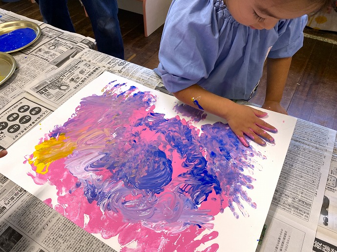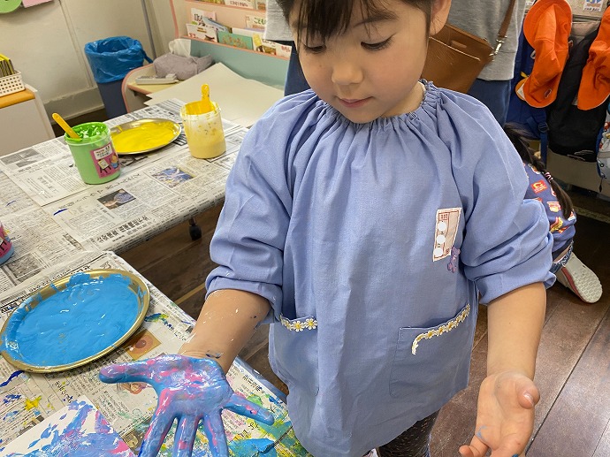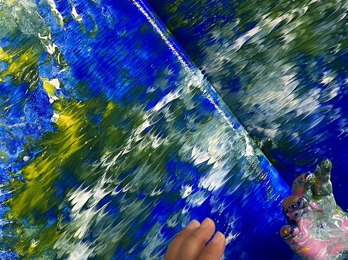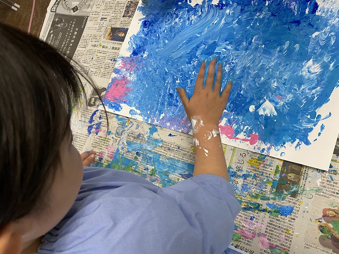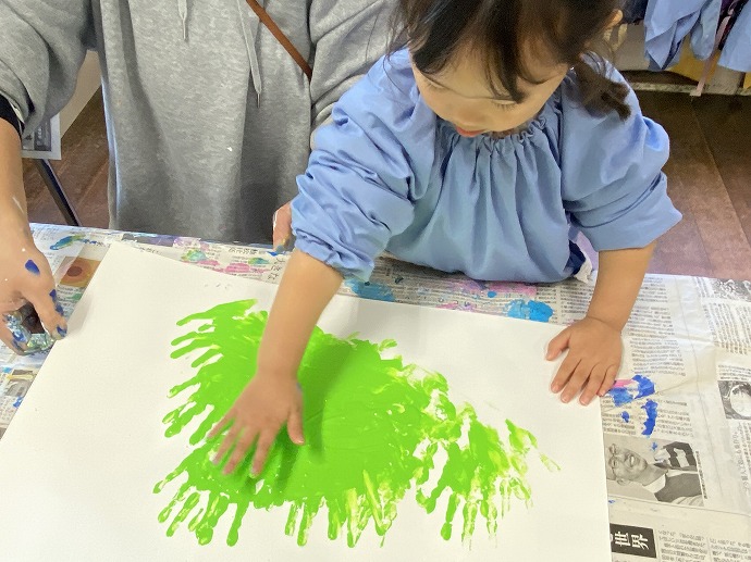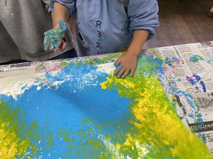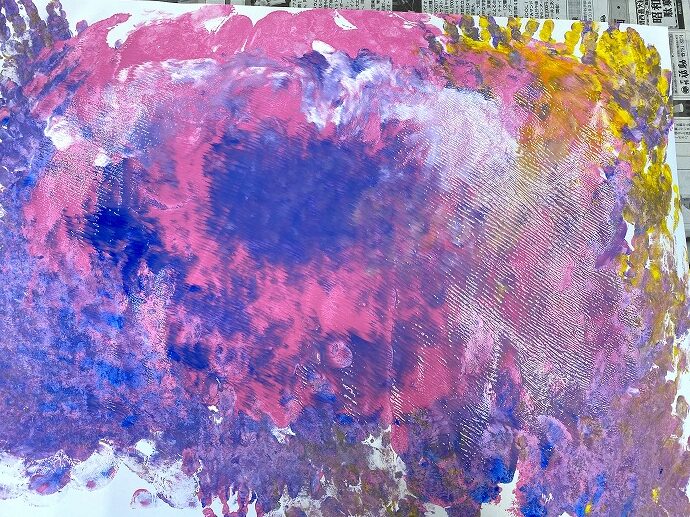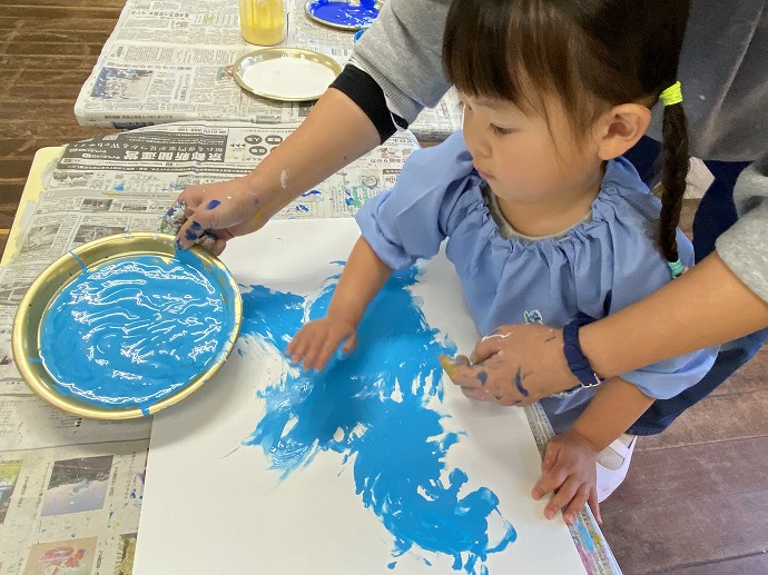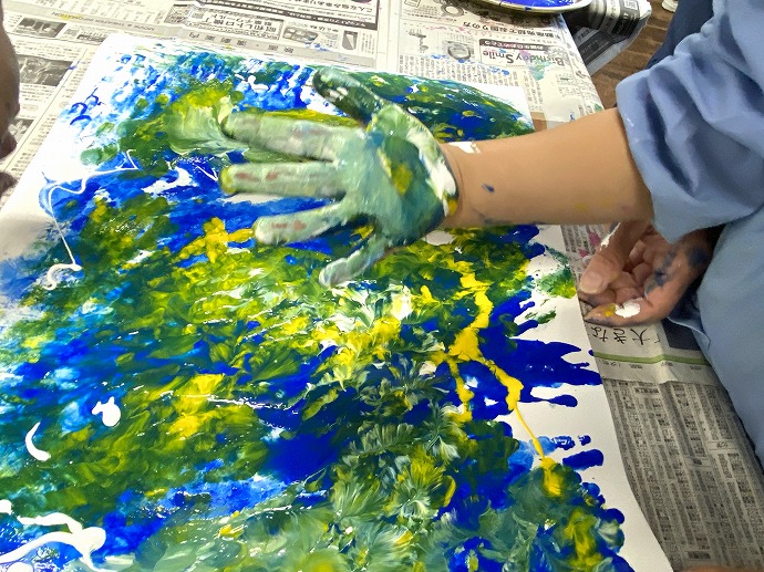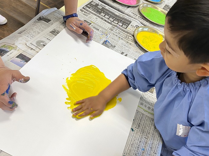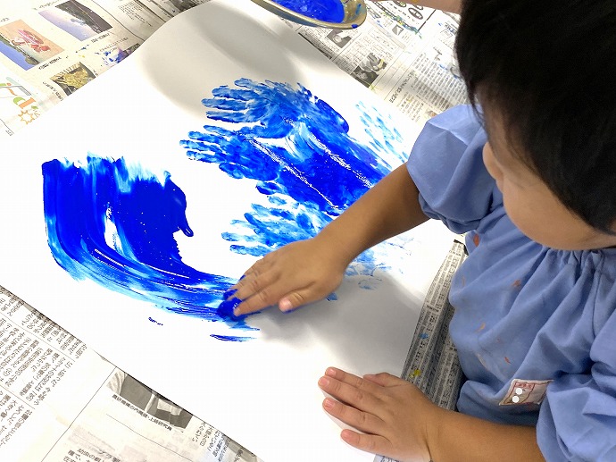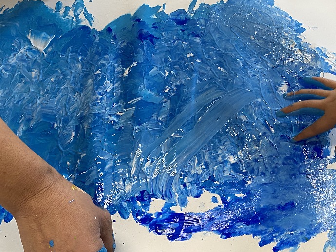 そこへ青色を選んで真ん中で混ぜてくるくる。絵の具に「糊」を混ぜているので伸びがよく、手の感触を気持ちよく楽しんでいます。「糊」を加えることは随分以前にtomomi先生と保育について話していた時、スライム遊びのように感触あそびも兼ねて気持ちよく取り組めるには?と考えついた方法です✨